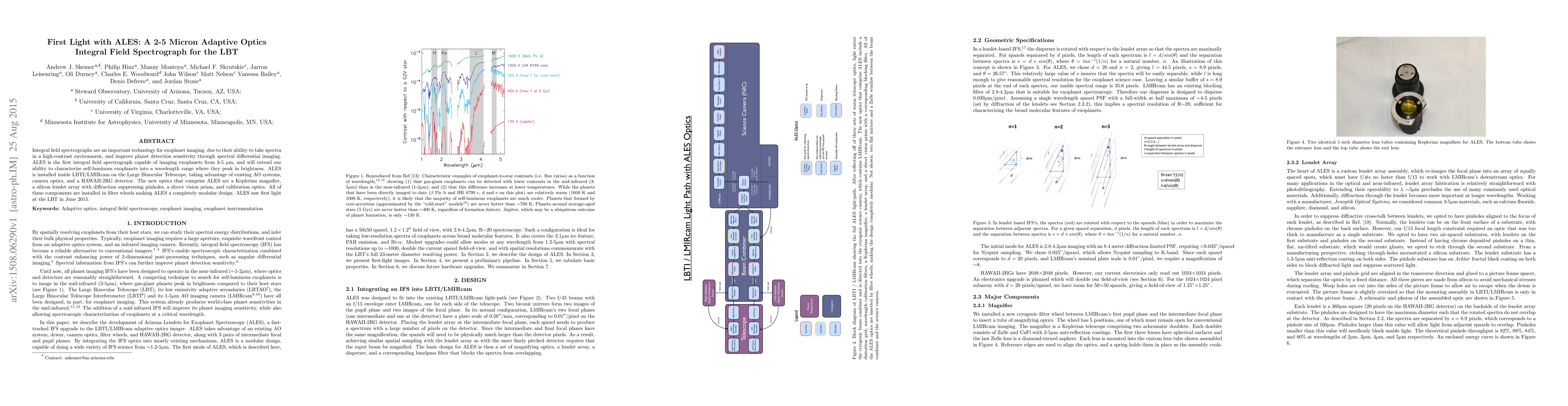 ALES is a pioneering 2-5 micron adaptive optics integral field spectrograph installed on the Large Binocular Telescope for exoplanet imaging. It achieved first light in June 2015, offering enhanced detection sensitivity through spectral differential imaging.