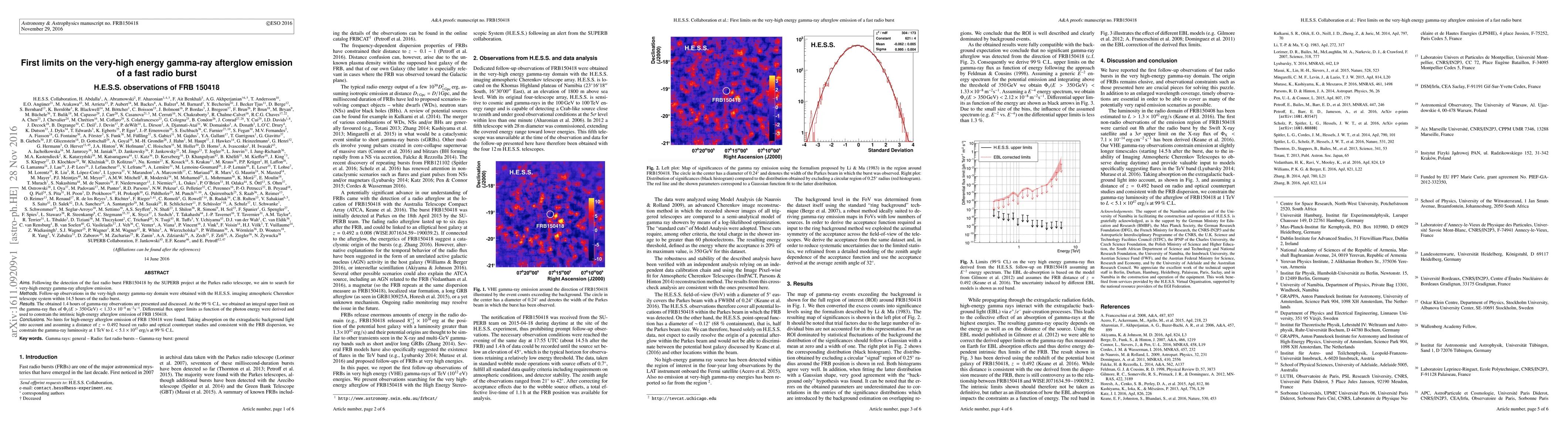 The H.E.S.S. telescope system observed the fast radio burst FRB 150418 for very-high energy gamma-ray afterglow emission, finding no significant emission at 99% confidence level. The study constrains the gamma-ray luminosity at 1 TeV to less than 5.1 x 10^47 erg/s.