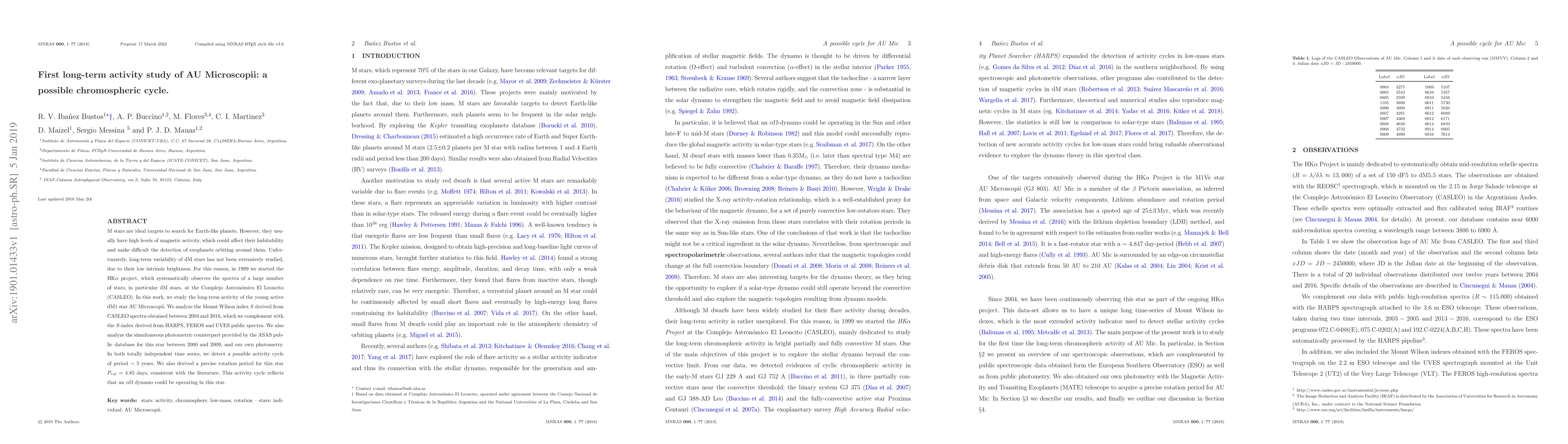 M stars are ideal targets to search for Earth-like planets. However, they usually have high levels of magnetic activity, which could affect their habitability and make difficult the detection of exoplanets orbiting around them. Unfortunately, long-term variability of dM stars has not been extensively studied, due to their low intrinsic brightness. For this reason, in 1999 we started the HKalpha project, which systematically observes the spectra of a large number of stars, in particular dM stars, at the Complejo Astronomico El Leoncito (CASLEO). In this work, we study the long-term activity of the young active dM1 star AU Microscopii. We analyze the Mount Wilson index S derived from CASLEO spectra obtained between 2004 and 2016, which we complement with the S-index derived from HARPS, FEROS and UVES public spectra. We also analyze the simultaneous photometric counterpart provided by the ASAS public database for this star between 2000 and 2009, and our own photometry. In both totally independent time series, we detect a possible activity cycle of period around 5 years. We also derived a precise rotation period for this star P rot = 4.85 days, consistent with the literature. This activity cycle reflects that an alphaOmega dynamo could be operating in this star.