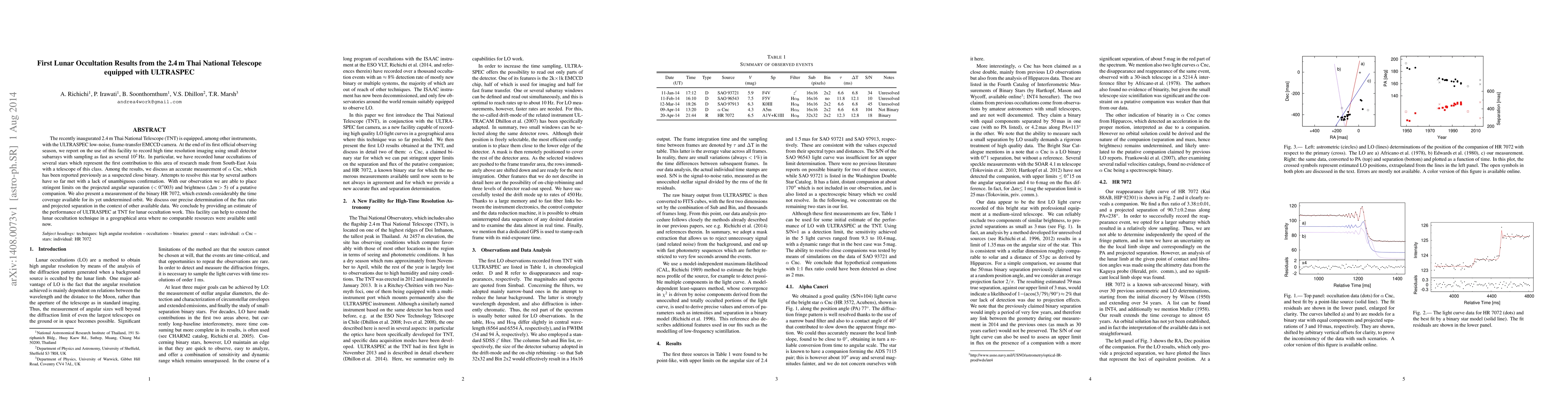 The recently inaugurated 2.4\,m Thai National Telescope (TNT) is equipped, among other instruments, with the ULTRASPEC low-noise, frame-transfer EMCCD camera. At the end of its first official observing season, we report on the use of this facility to record high time resolution imaging using small detector subarrays with sampling as fast as several $10^2$\,Hz. In particular, we have recorded lunar occultations of several stars which represent the first contribution to this area of research made from South-East Asia with a telescope of this class. Among the results, we discuss an accurate measurement of $\alpha $~Cnc, which has been reported previously as a suspected close binary. Attempts to resolve this star by several authors have so far met with a lack of unambiguous confirmation. With our observation we are able to place stringent limits on the projected angular separation ($<0\farcs003$) and brightness ($\Delta{\rm m} > 5$) of a putative companion. We also present a measurement of the binary {HR~7072}, which extends considerably the time coverage available for its yet undetermined orbit. We discuss our precise determination of the flux ratio and projected separation in the context of other available data. We conclude by providing an estimate of the performance of ULTRASPEC at TNT for lunar occultation work. This facility can help to extend the lunar occultation technique in a geographical area where no comparable resources were available until now.