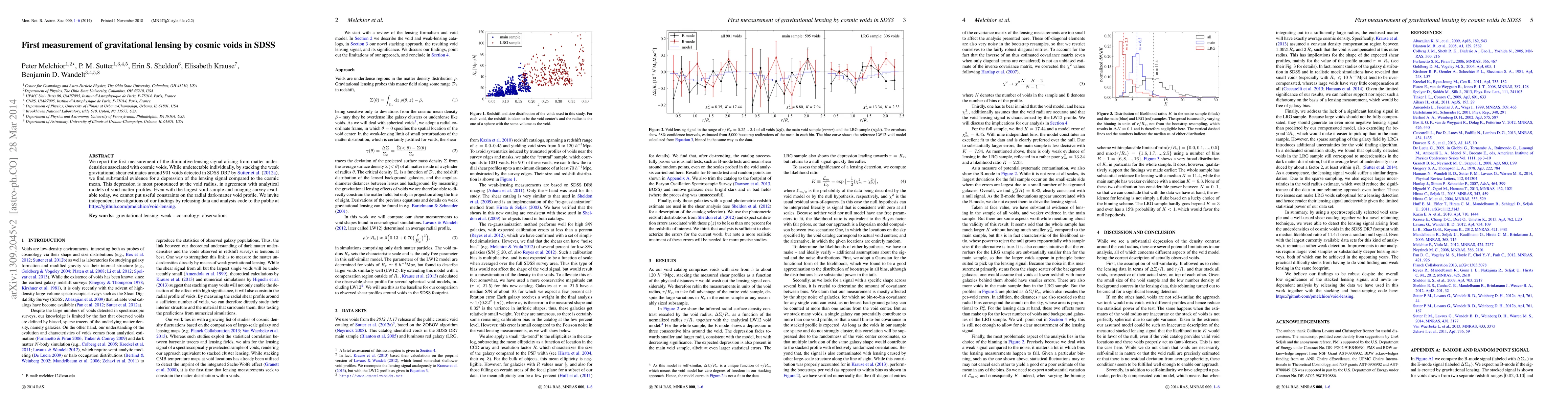 We report the first measurement of the diminutive lensing signal arising from matter underdensities associated with cosmic voids. While undetectable individually, by stacking the weak gravitational shear estimates around 901 voids detected in SDSS DR7 by Sutter et al. (2012a), we find substantial evidence for a depression of the lensing signal compared to the cosmic mean. This depression is most pronounced at the void radius, in agreement with analytical models of void matter profiles. Even with the largest void sample and imaging survey available today, we cannot put useful constraints on the radial dark-matter void profile. We invite independent investigations of our findings by releasing data and analysis code to the public at https://github.com/pmelchior/void-lensing