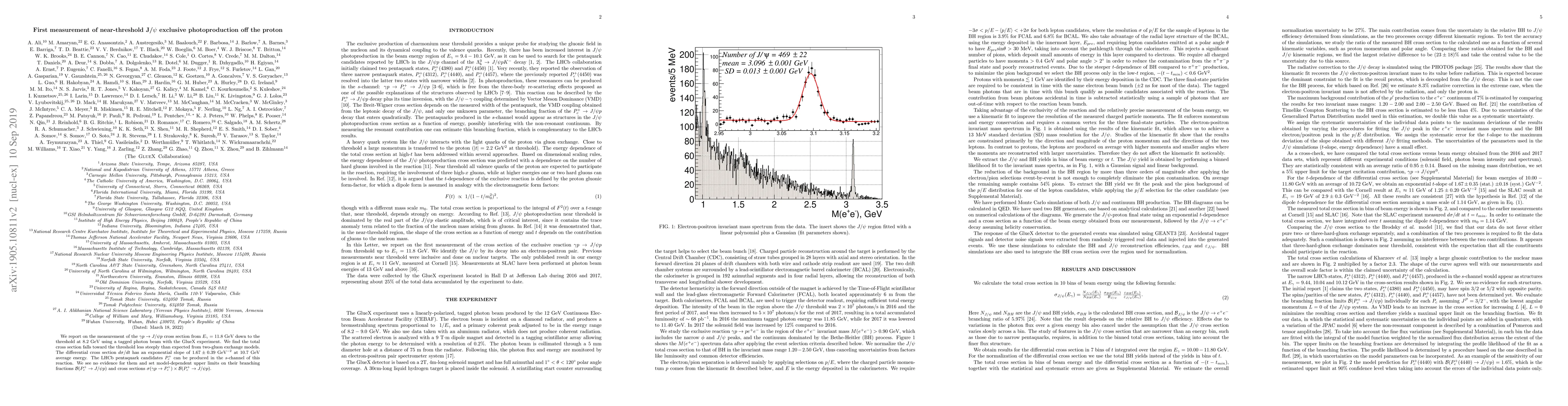 We report on the measurement of the $\gamma p \rightarrow J/\psi p$ cross section from $E_\gamma = 11.8$ GeV down to the threshold at $8.2$ GeV using a tagged photon beam with the GlueX experiment. We find the total cross section falls toward the threshold less steeply than expected from two-gluon exchange models. The differential cross section $d\sigma /dt$ has an exponential slope of $1.67 \pm 0.39$ GeV$^{-2}$ at $10.7$ GeV average energy. The LHCb pentaquark candidates $P_c^+$ can be produced in the $s$-channel of this reaction. We see no evidence for them and set model-dependent upper limits on their branching fractions $\mathcal{B}(P_c^+ \rightarrow J/\psi p)$ and cross sections $\sigma(\gamma p \to P_c^+)\times\mathcal{B}(P_c^+ \to J/\psi p) $.