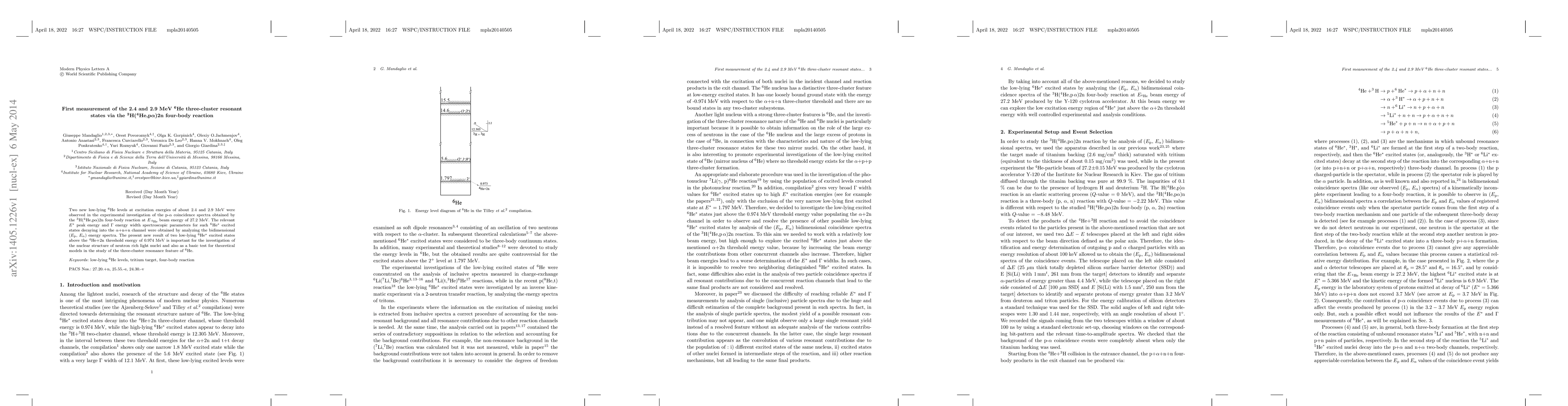 Two new low-lying $^6$He levels at excitation energies of about 2.4 and 2.9 MeV were observed in the experimental investigation of the p-$\alpha$ coincidence spectra obtained by the $^3$H($^4$He,p$\alpha$)2n four-body reaction at $E_{\rm \,^4He}$ beam energy of 27.2 MeV. The relevant $E^*$ peak energy and $\Gamma$ energy width spectroscopic parameters for such $^6$He$^*$ excited states decaying into the $\alpha$+n+n channel were obtained by analyzing the bidimensional ($E_{\rm p}$, $E_{\rm \alpha}$) energy spectra. The present new result of two low-lying $^6$He$^*$ excited states above the $^4$He+2n threshold energy of 0.974 MeV is important for the investigation of the nuclear structure of neutron rich light nuclei and also as a basic test for theoretical models in the study of the three-cluster resonance feature of $^6$He.