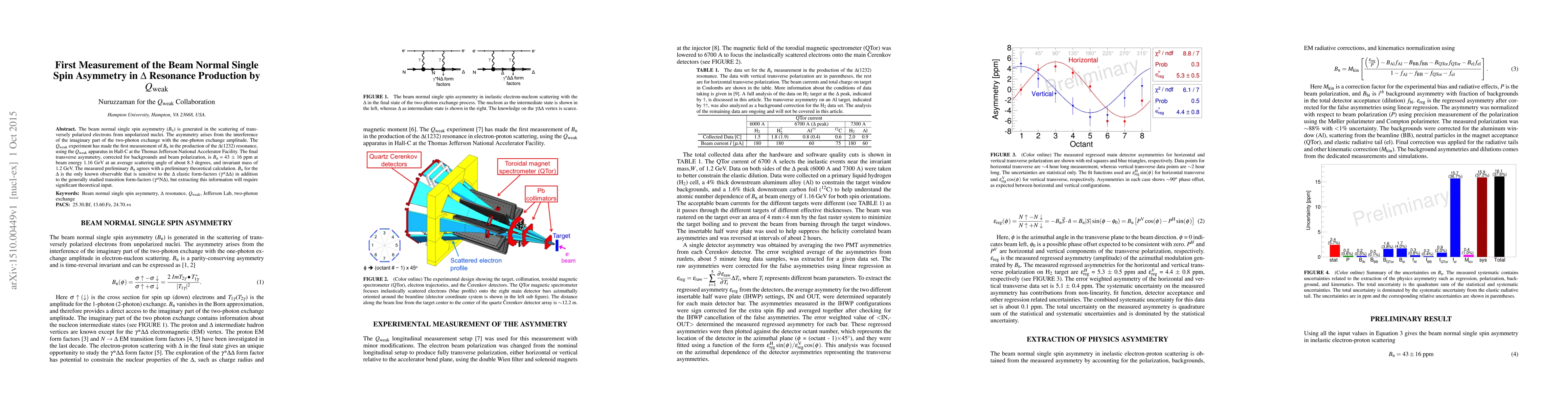 The beam normal single spin asymmetry ($B_{\rm n}$) is generated in the scattering of transversely polarized electrons from unpolarized nuclei. The asymmetry arises from the interference of the imaginary part of the two-photon exchange with the one-photon exchange amplitude. The $Q_{\rm weak}$ experiment has made the first measurement of $B_{\rm n}$ in the production of the $\Delta$(1232) resonance, using the $Q_{\rm weak}$ apparatus in Hall-C at the Thomas Jefferson National Accelerator Facility. The final transverse asymmetry, corrected for backgrounds and beam polarization, is $B_{\rm n}$ = 43 $\pm$ 16 ppm at beam energy 1.16 GeV at an average scattering angle of about 8.3 degrees, and invariant mass of 1.2 GeV. The measured preliminary $B_{\rm n}$ agrees with a preliminary theoretical calculation. $B_{\rm n}$ for the $\Delta$ is the only known observable that is sensitive to the $\Delta$ elastic form-factors ($\gamma$*$\Delta\Delta$) in addition to the generally studied transition form-factors ($\gamma$*N$\Delta$), but extracting this information will require significant theoretical input.