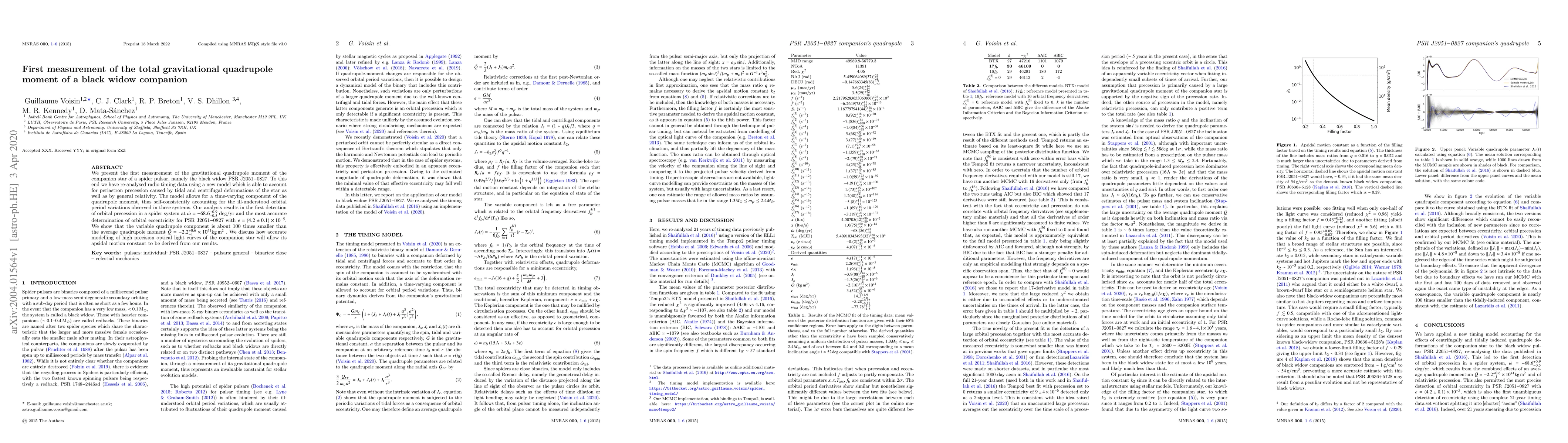 We present the first measurement of the gravitational quadrupole moment of the companion star of a spider pulsar, namely the black widow PSR J2051$-$0827. To this end we have re-analysed radio timing data using a new model which is able to account for periastron precession caused by tidal and centrifugal deformations of the star as well as by general relativity. The model allows for a time-varying component of the quadrupole moment, thus self-consistently accounting for the ill-understood orbital period variations observed in these systems. Our analysis results in the first detection of orbital precession in a spider system at $\dot{\omega} = -68.6_{-0.5}^{+0.9}$ deg/yr and the most accurate determination of orbital eccentricity for PSR J2051$-$0827 with $e = (4.2 \pm 0.1) \times 10^{-5}$. We show that the variable quadrupole component is about 100 times smaller than the average quadrupole moment $\bar{Q} = -2.2_{-1}^{+0.6} \times 10^{41}$ kg.m$^2$. We discuss how accurate modelling of high precision optical light curves of the companion star will allow its apsidal motion constant to be derived from our results.