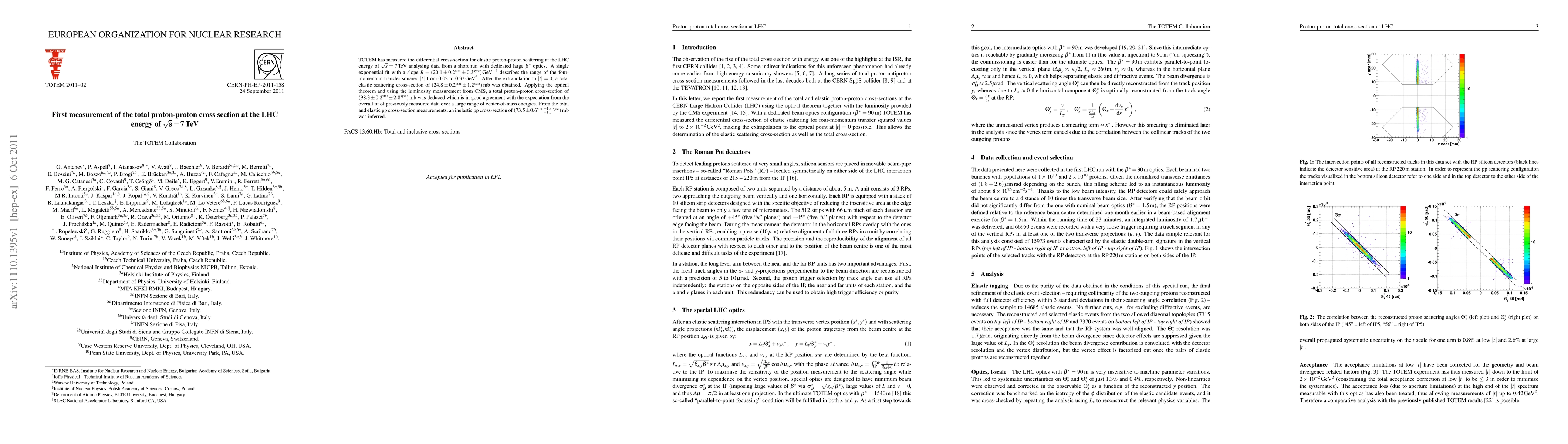 The TOTEM collaboration measured the total proton-proton cross section at the LHC energy of √s = 7 TeV, obtaining a value of (98.3 ± 0.2stat ± 2.8syst) mb, consistent with previous data fits. The inelastic cross-section was inferred to be (73.5 ± 0.6stat ± 1.8 - 1.3syst) mb.