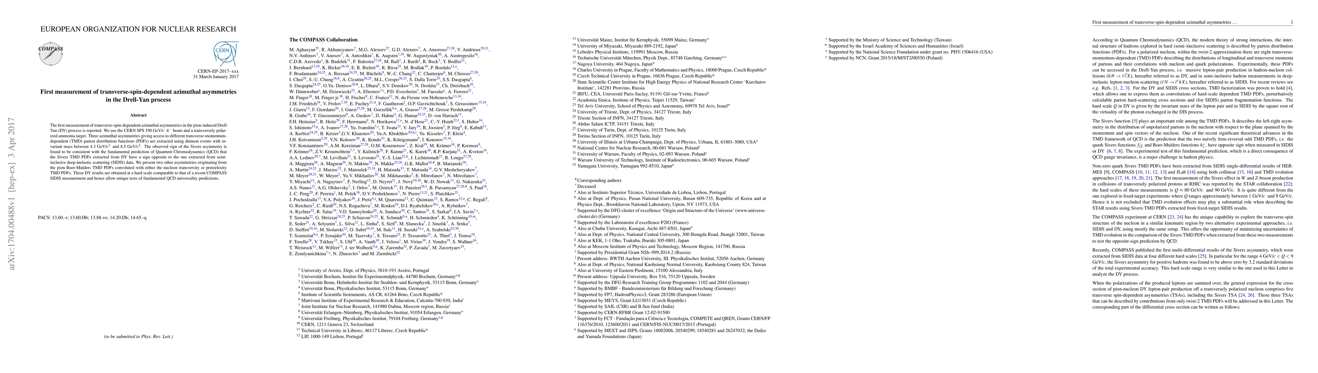 This paper reports the first measurement of transverse-spin-dependent azimuthal asymmetries in the pion-induced Drell-Yan process, revealing three asymmetries linked to different TMD PDFs. The observed sign of the Sivers asymmetry aligns with QCD predictions, contrasting with SIDIS data.