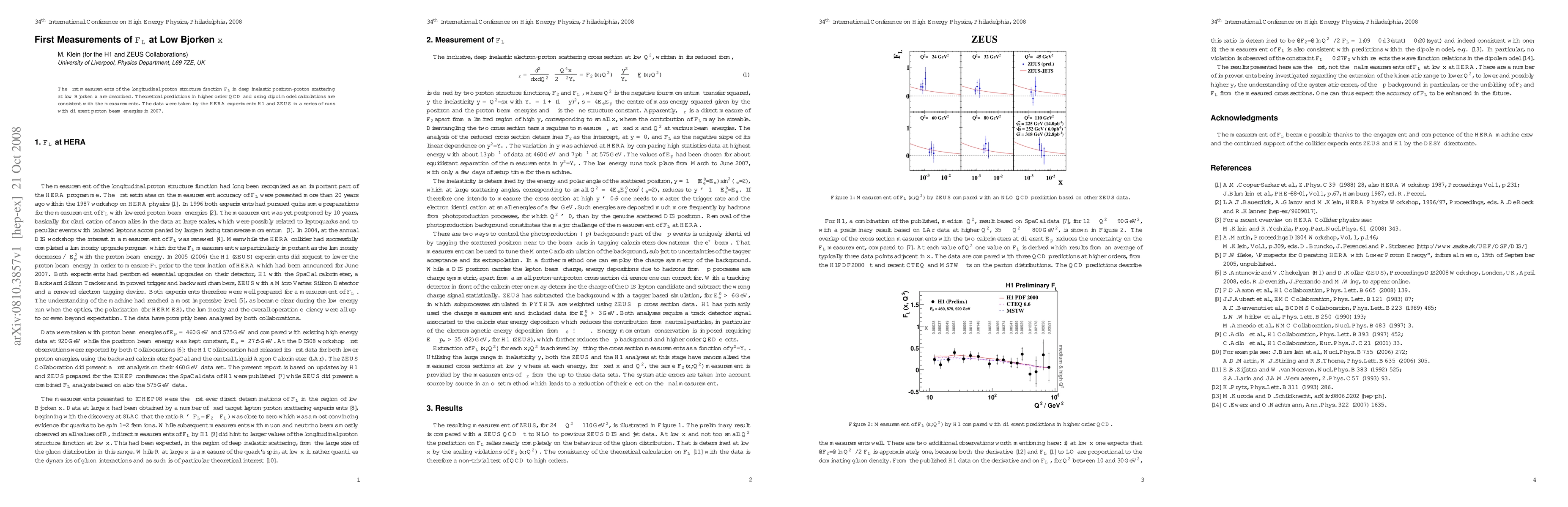 The first measurements of the longitudinal proton structure function FL in deep inelastic positron-proton scattering at low Bjorken x are described. Theoretical predictions in higher order QCD and using dipol model calculations are consistent with the measurements. The data were taken by the HERA experiments H1 and ZEUS in a series of runs with different proton beam energies in 2007.
