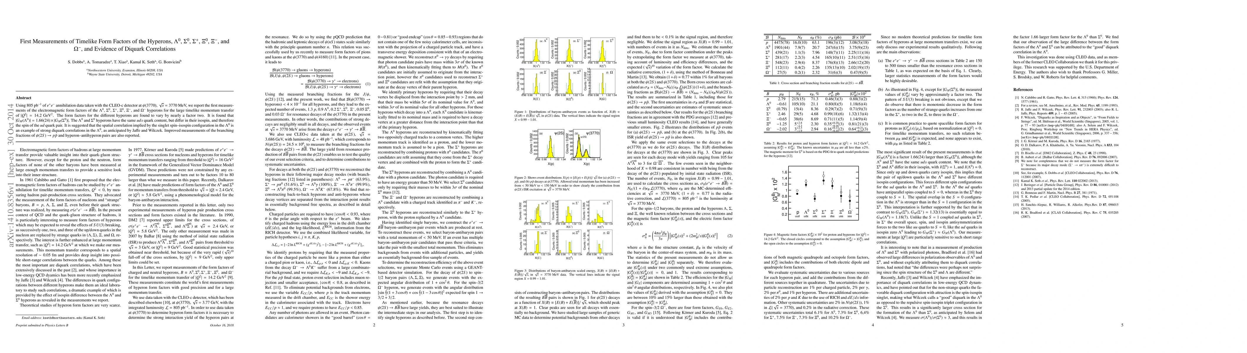 Using 805 pb^-1 of e+e- annihilation data taken with the CLEO-c detector at psi(3770), sqrt{s}=3770 MeV, we report the first measurements of the electromagnetic form factors of the Lambda0, Sigma0, Sigma+, Xi0, Xi-, and Omega- hyperons for the large timelike momentum transfer of |Q^2|=14.2 GeV^2. The form factors for the different hyperons are found to vary by nearly a factor two. It is found that |G_M(Lambda0)|=1.66(24) x |G_M(Sigma0)|. The Lambda0 and Sigma0 hyperons have the same uds quark content, but differ in their isospin, and therefore the spin of the $ud$ quark pair. It is suggested that the spatial correlation implied by the singlet spin--isospin configuration in the Lambda0 is an example of strong diquark correlations in the Lambda0, as anticipated by Jaffe and Wilczek. Improved measurements of the branching fractions of psi(2S) -> p pbar and hyperon--antihyperon pairs are also reported.