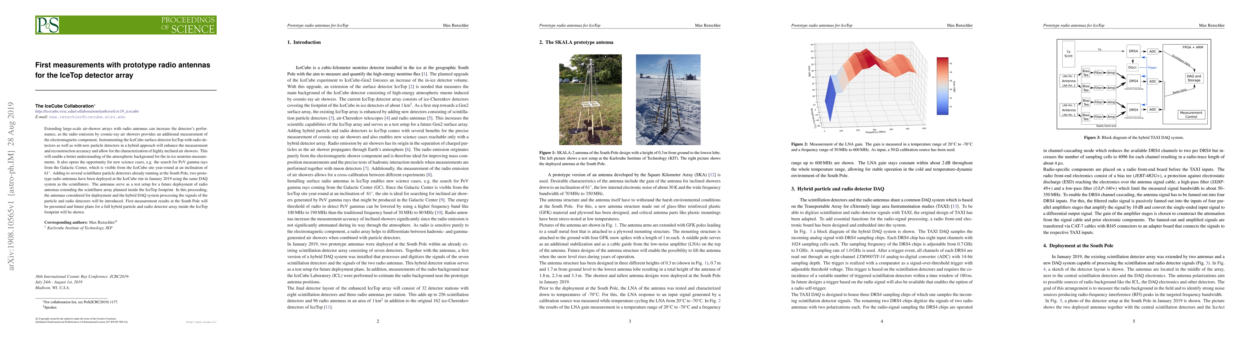 This paper reports on the initial deployment and measurements of prototype radio antennas at the IceCube site to enhance the IceTop detector's performance by capturing the electromagnetic component of cosmic-ray air showers. The hybrid approach combining radio and particle detectors aims to improve air shower reconstruction and open new scientific opportunities, such as the search for PeV gamma rays.