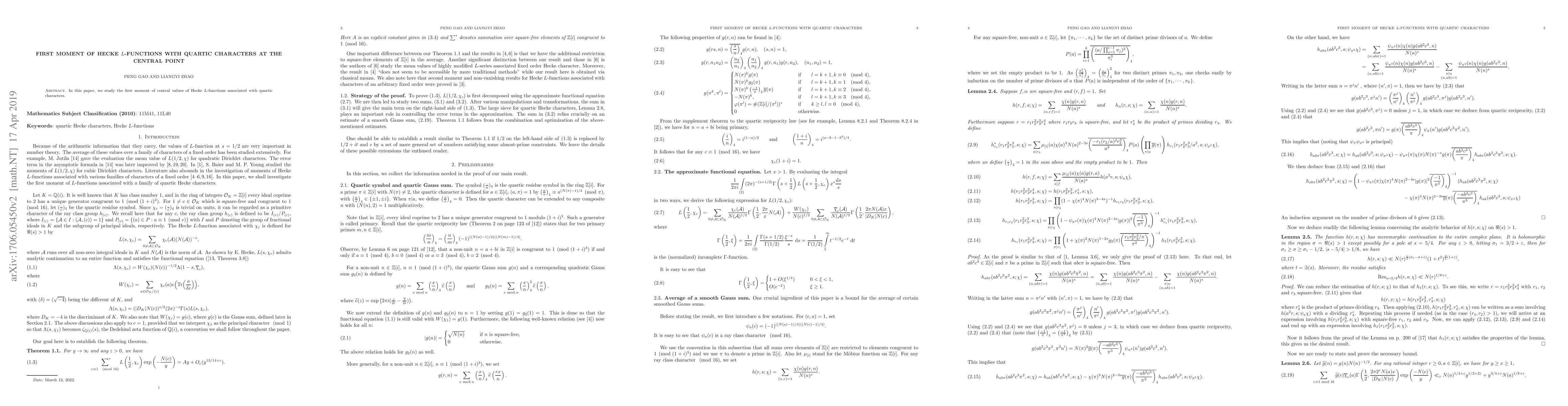Summary: This research investigates the first moment of central values of Hecke $L$-functions linked to quartic Dirichlet characters, providing insights into their distribution and behavior at the central point.