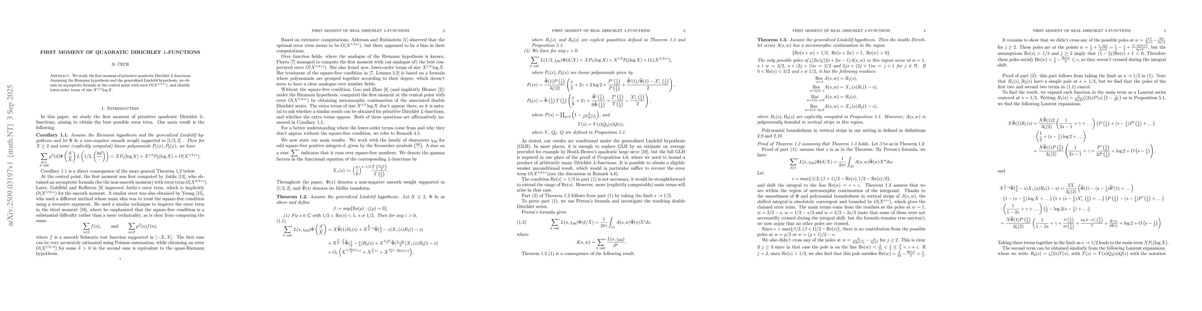 We study the first moment of primitive quadratic Dirichlet $L$-functions. Assuming the Riemann hypothesis and the generalized Lindel\"of hypothesis, we obtain an asymptotic formula at the central point with error $O(X^{1/4+\epsilon})$, and identify lower-order terms of size $X^{1/3}\log X$.