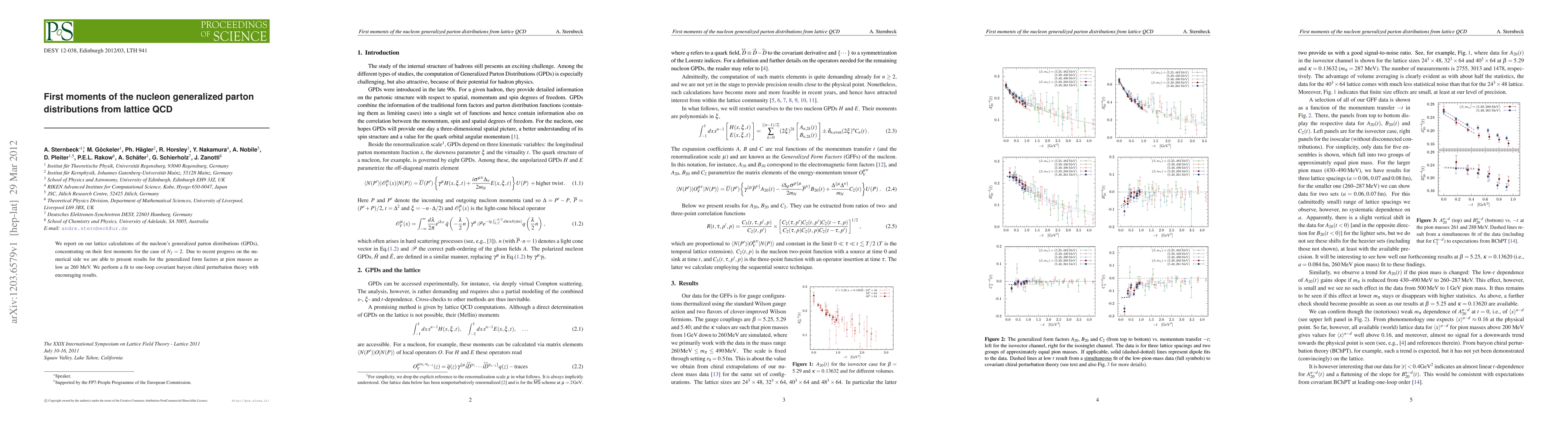 We report on our lattice calculations of the nucleon's generalized parton distributions (GPDs), concentrating on their first moments for the case of N_f=2. Due to recent progress on the numerical side we are able to present results for the generalized form factors at pion masses as low as 260 MeV. We perform a fit to one-loop covariant baryon chiral perturbation theory with encouraging results.