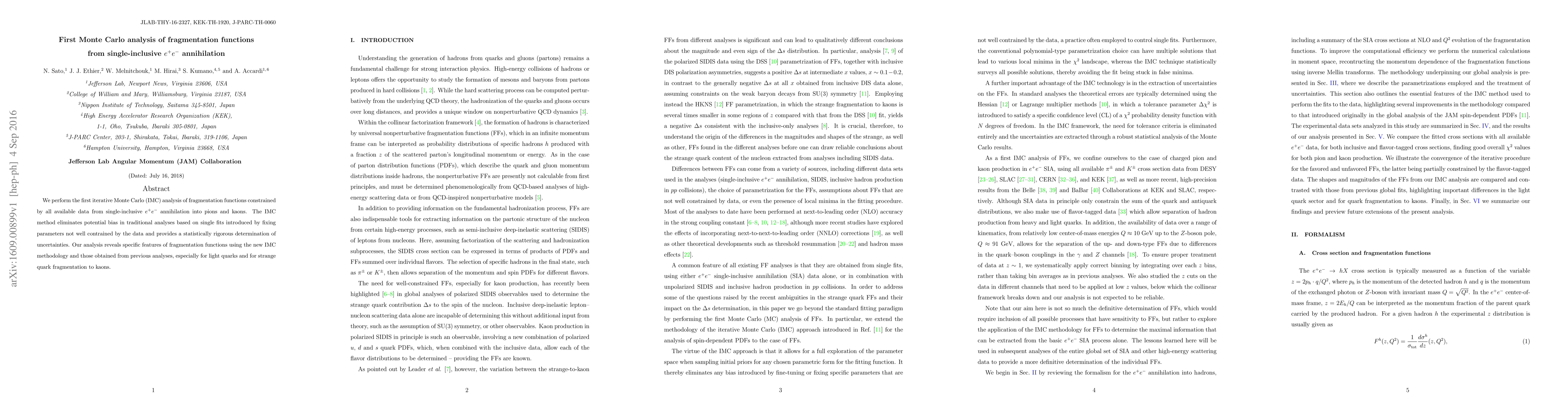 This paper presents the first Monte Carlo analysis of fragmentation functions from single-inclusive $e^+ e^-$ annihilation, using an iterative Monte Carlo method to avoid biases from traditional analyses. This new approach provides a more rigorous determination of uncertainties and reveals distinct features in fragmentation functions, particularly for light and strange quarks.