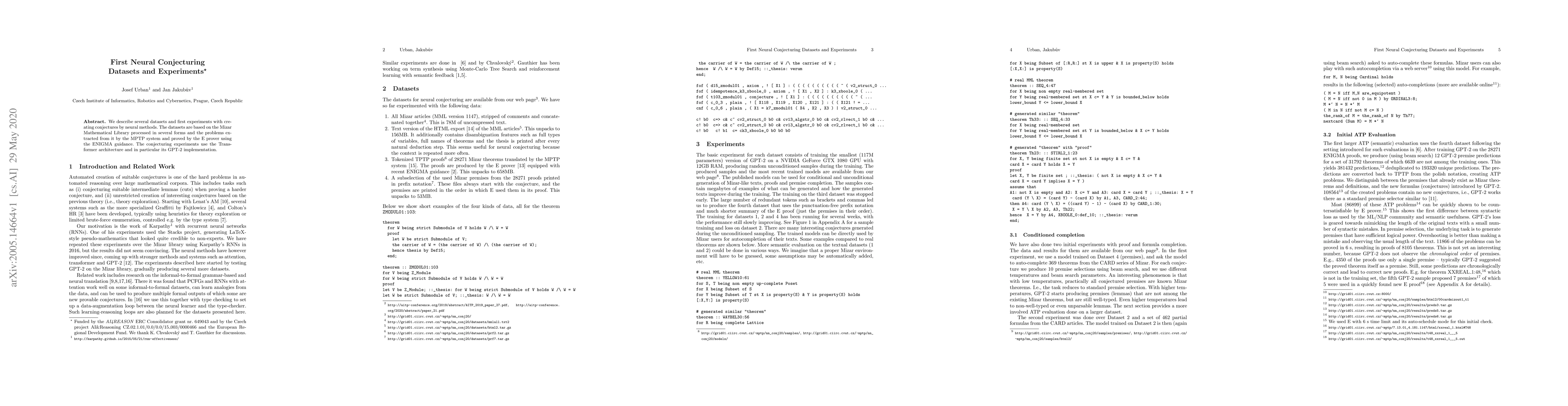 We describe several datasets and first experiments with creating conjectures by neural methods. The datasets are based on the Mizar Mathematical Library processed in several forms and the problems extracted from it by the MPTP system and proved by the E prover using the ENIGMA guidance. The conjecturing experiments use the Transformer architecture and in particular its GPT-2 implementation.