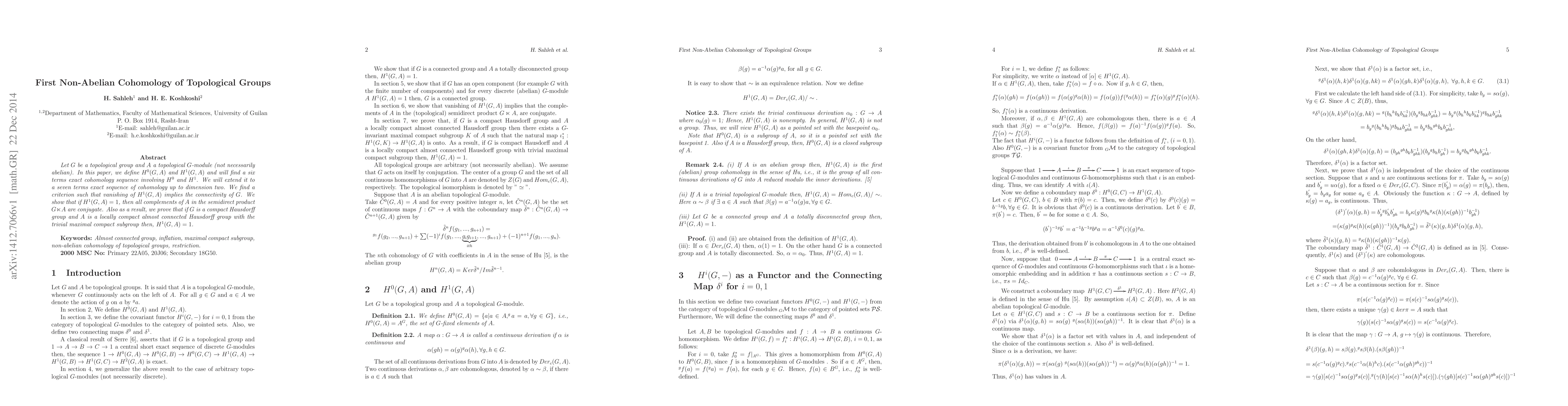This paper defines $H^{0}(G,A)$ and $H^{1}(G,A)$ for topological groups $G$ and $G$-modules $A$, and constructs a six-term exact cohomology sequence extending to a seven-term sequence. It establishes that vanishing $H^{1}(G,A)$ implies $G$'s connectivity and shows that $H^{1}(G,A)=1$ leads to all complements of $A$ in $G\ltimes A$ being conjugate.