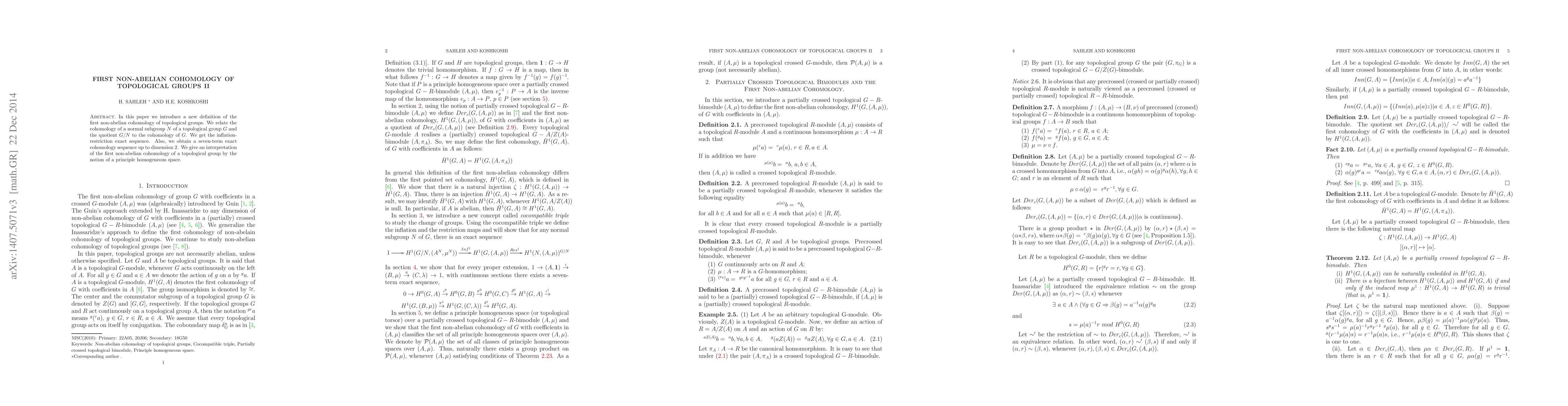 This paper introduces a new definition for the first non-abelian cohomology of topological groups, establishing an inflation-restriction exact sequence and a seven-term exact cohomology sequence up to dimension 2. It interprets the first non-abelian cohomology as a principle homogeneous space.
