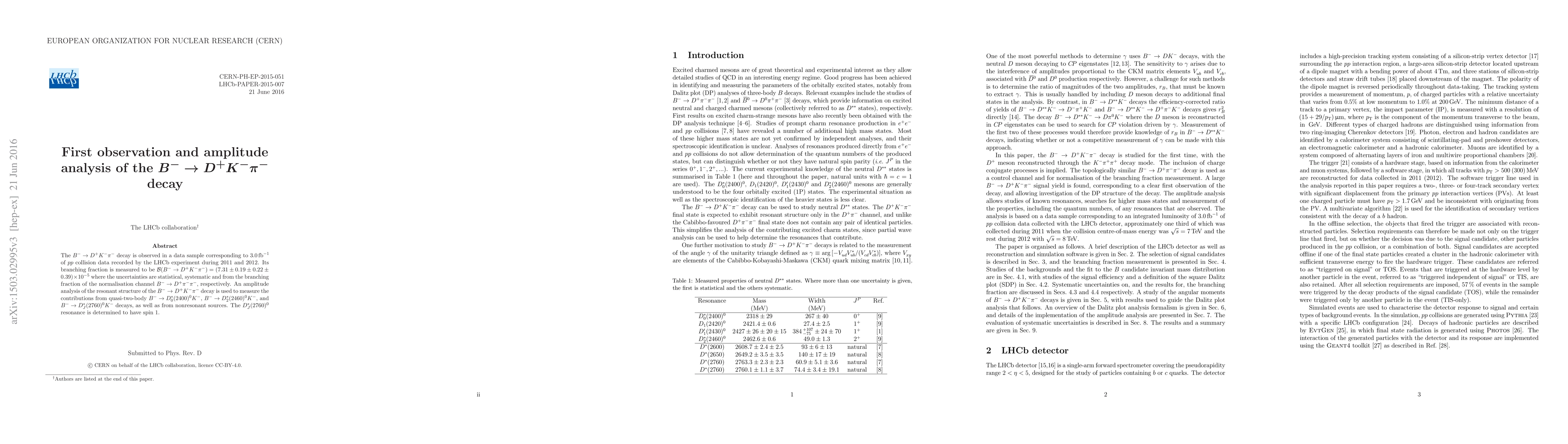 The $B^{-}\to D^{+}K^{-}\pi^{-}$ decay is observed in a data sample corresponding to $3.0~\rm{fb}^{-1}$ of $pp$ collision data recorded by the LHCb experiment during 2011 and 2012. Its branching fraction is measured to be ${\cal B}(B^{-}\to D^{+}K^{-}\pi^{-}) = (7.31 \pm 0.19 \pm 0.22 \pm 0.39) \times 10^{-5}$ where the uncertainties are statistical, systematic and from the branching fraction of the normalisation channel $B^{-}\to D^{+}\pi^{-}\pi^{-}$, respectively. An amplitude analysis of the resonant structure of the $B^{-}\to D^{+}K^{-}\pi^{-}$ decay is used to measure the contributions from quasi-two-body $B^{-}\to D_{0}^{*}(2400)^{0}K^{-}$, $B^{-}\to D_{2}^{*}(2460)^{0}K^{-}$, and $B^{-}\to D_{J}^{*}(2760)^{0}K^{-}$ decays, as well as from nonresonant sources. The $D_{J}^{*}(2760)^{0}$ resonance is determined to have spin~1.