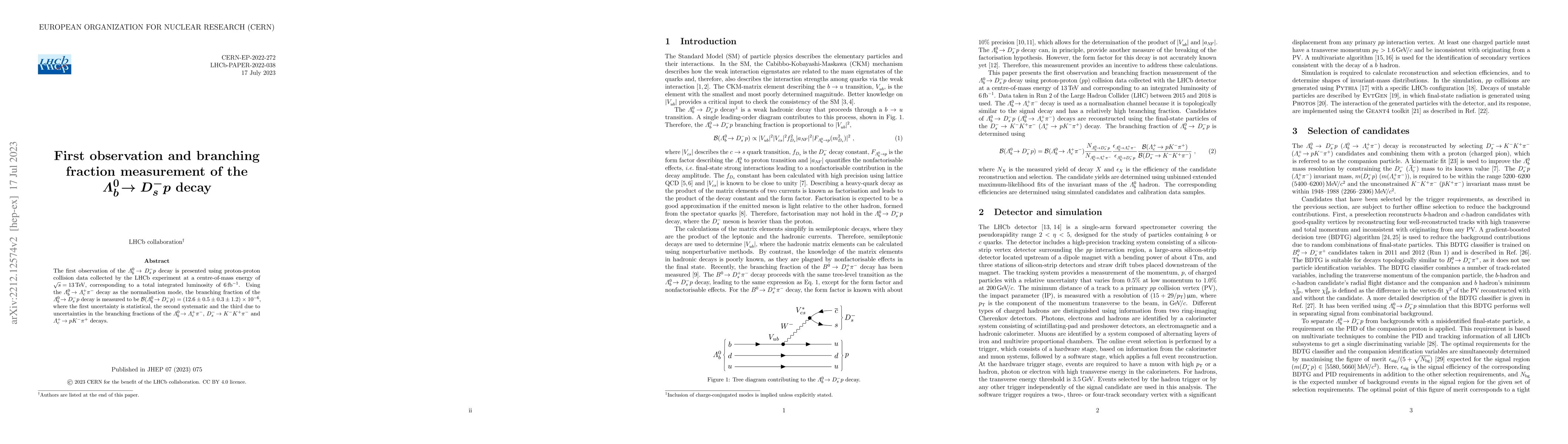 The first observation of the $\Lambda_b^0\to D_s^- p$ decay is reported using LHCb data at 13 TeV, with a measured branching fraction of $(12.6 \pm 0.5 \pm 0.3 \pm 1.2 )\times 10^{-6}$. This decay provides new insights into the properties of baryons and their interactions.