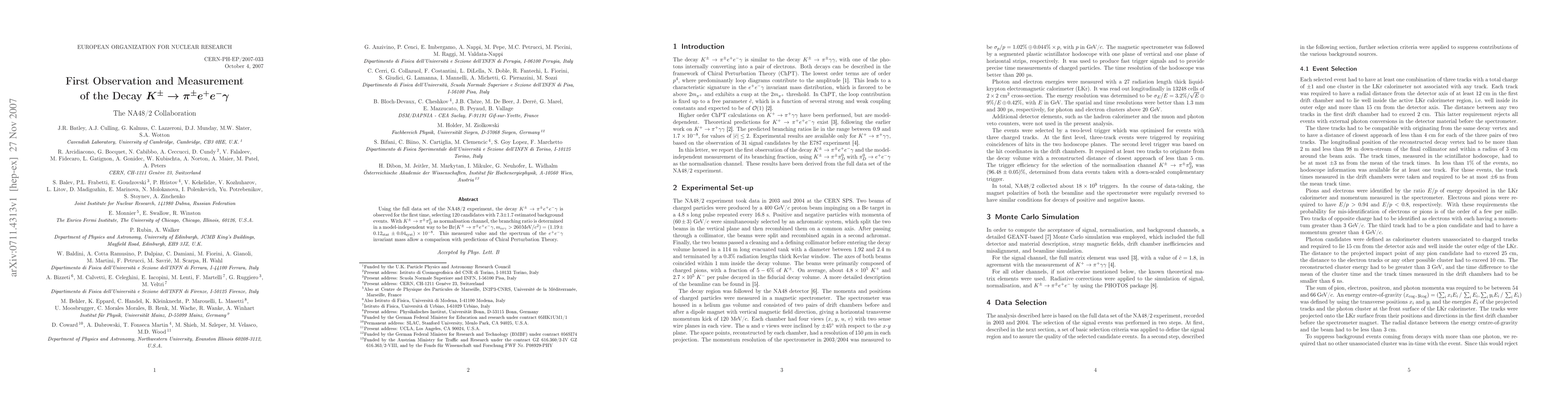 The NA48/2 experiment first observed the decay K+- -> pi+- e+ e- gamma, determining a branching ratio of (1.19 ± 0.12_stat ± 0.04_syst) x 10^-8. This result allows comparison with Chiral Perturbation Theory predictions.