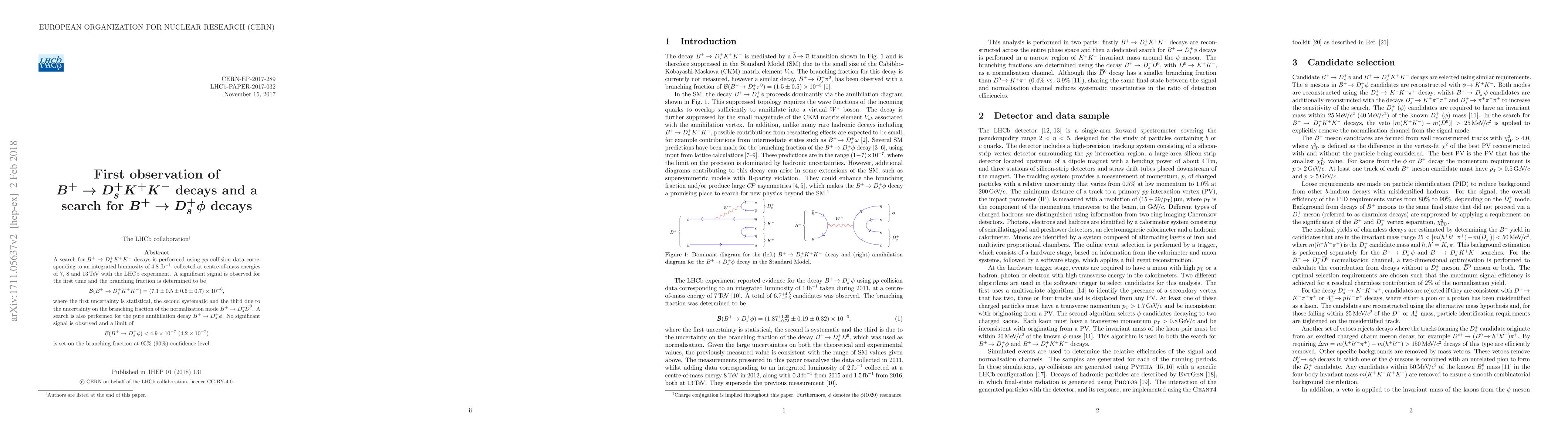 Researchers at LHCb observe a significant signal for $B^{+} o D_s^{+}K^{+}K^{-}$ decays with a branching fraction of $(7.1 imes 10^{-6})$, setting an upper limit on $B^{+} o D_s^{+} heta$ decays at $(4.9 imes 10^{-7})$.