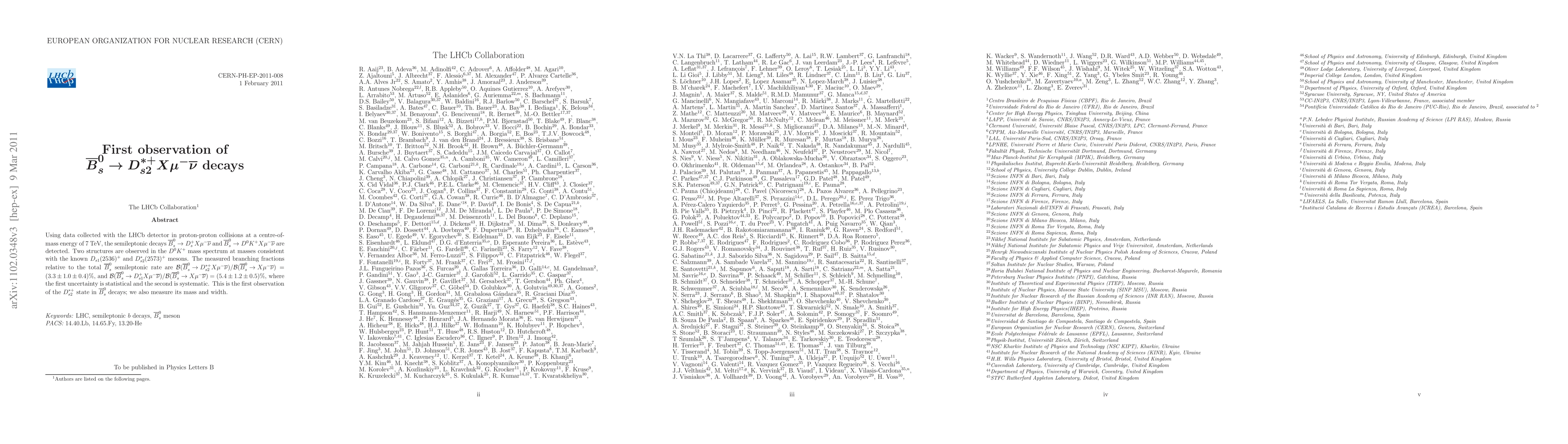 Using data collected with the LHCb detector in proton-proton collisions at a centre-of-mass energy of 7 TeV, the semileptonic decays Bs -> Ds+ X mu nu and Bs -> D0 K+ X mu nu are detected. Two structures are observed in the D0 K+ mass spectrum at masses consistent with the known D^+_{s1}(2536) and $D^{*+}_{s2}(2573) mesons. The measured branching fractions relative to the total Bs semileptonic rate are B(Bs -> D_{s2}^{*+} X mu nu)/B(Bs -> X mu nu)= (3.3\pm 1.0\pm 0.4)%, and B(Bs -> D_{s1}^+ X munu)/B(Bs -> X mu nu)= (5.4\pm 1.2\pm 0.5)%, where the first uncertainty is statistical and the second is systematic. This is the first observation of the D_{s2}^{*+} state in Bs decays; we also measure its mass and width.