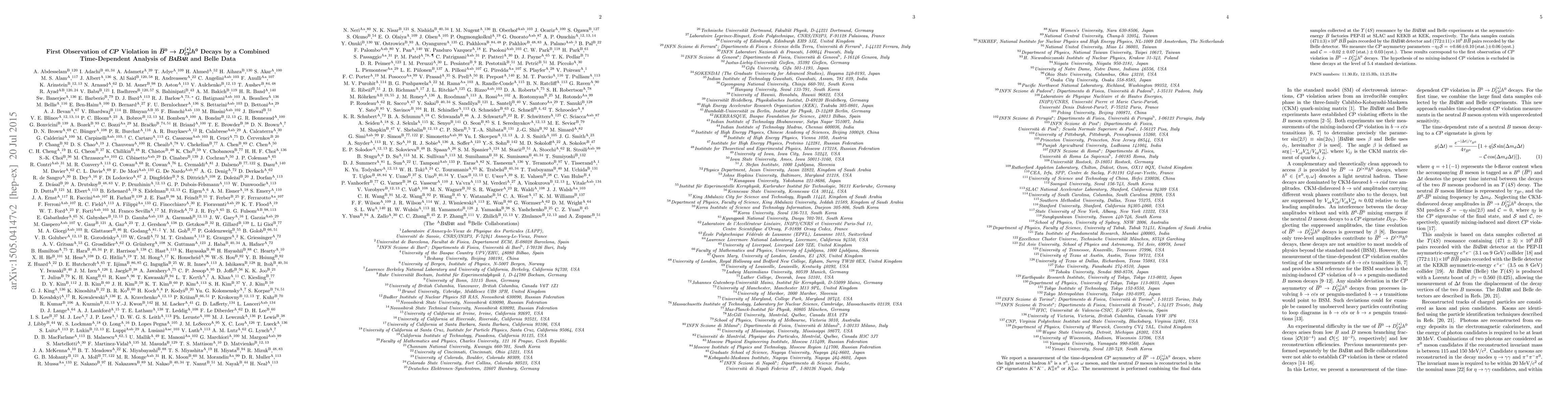 This paper reports the first observation of CP violation in B0->D(*)CP h0 decays using combined data from the BaBar and Belle experiments, measuring the CP asymmetry parameters and excluding the hypothesis of no mixing-induced CP violation at 5.4 standard deviations.