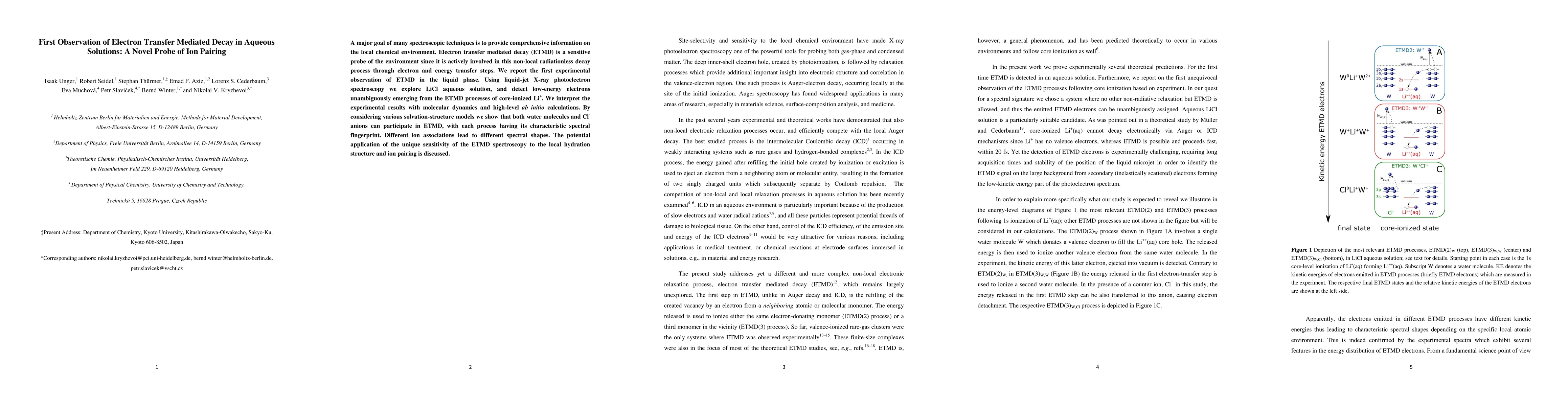 A major goal of many spectroscopic techniques is to provide comprehensive information on the local chemical environment. Electron transfer mediated decay (ETMD) is a sensitive probe of the environment since it is actively involved in this non-local radiationless decay process through electron and energy transfer steps. We report the first experimental observation of ETMD in the liquid phase. Using liquid-jet X-ray photoelectron spectroscopy we explore LiCl aqueous solution, and detect low-energy electrons unambiguously emerging from the ETMD processes of core-ionized Li+. We interpret the experimental results with molecular dynamics and high-level ab initio calculations. By considering various solvation-structure models we show that both water molecules and Cl- anions can participate in ETMD, with each process having its characteristic spectral fingerprint. Different ion associations lead to different spectral shapes. The potential application of the unique sensitivity of the ETMD spectroscopy to the local hydration structure and ion pairing is discussed.