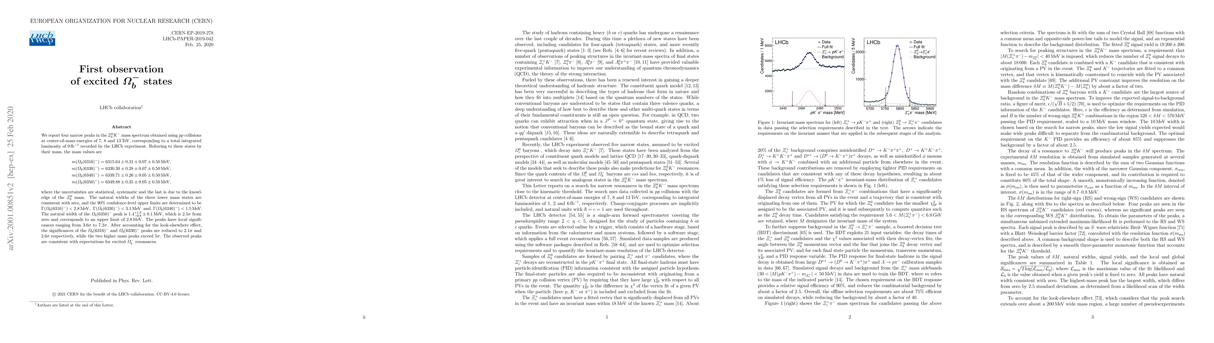 We report four narrow peaks in the $\Xi_b^0K^-$ mass spectrum obtained using $pp$ collisions at center-of-mass energies of 7, 8 and 13 TeV, corresponding to a total integrated luminosity of 9 fb$^{-1}$ recorded by the LHCb experiment. Referring to these states by their mass, the mass values are \begin{align*} m(\Omega_b(6316)^-) &= 6315.64\pm0.31\pm0.07\pm0.50 {\rm MeV}, \\ m(\Omega_b(6330)^-) &= 6330.30\pm0.28\pm0.07\pm0.50 {\rm MeV}, \\ m(\Omega_b(6340)^-) &= 6339.71\pm0.26\pm0.05\pm0.50 {\rm MeV}, \\ m(\Omega_b(6350)^-) &= 6349.88\pm0.35\pm0.05\pm0.50 {\rm MeV}, \end{align*}where the uncertainties are statistical, systematic and the last is due to the knowledge of the $\Xi_b^0$ mass. The natural widths of the three lower mass states are consistent with zero, and the 90% confidence-level upper limits are determined to be ${\Gamma(\Omega_b(6316)^-)<2.8}$ MeV, ${\Gamma(\Omega_b(6330)^-)<3.1}$ MeV and ${\Gamma(\Omega_b(6340)^-)<1.5}$ MeV. The natural width of the $\Omega_b(6350)^-$ peak is $1.4^{+1.0}_{-0.8}\pm0.1$ MeV, which is 2.5$\sigma$ from zero and corresponds to an upper limit of 2.8 MeV. The peaks have local significances ranging from 3.6$\sigma$ to 7.2$\sigma$. After accounting for the look-elsewhere effect, the significances of the $\Omega_b(6316)^-$ and $\Omega_b(6330)^-$ peaks are reduced to 2.1$\sigma$ and 2.6$\sigma$ respectively, while the two higher mass peaks exceed 5$\sigma$. The observed peaks are consistent with expectations for excited $\Omega_b^-$ resonances.