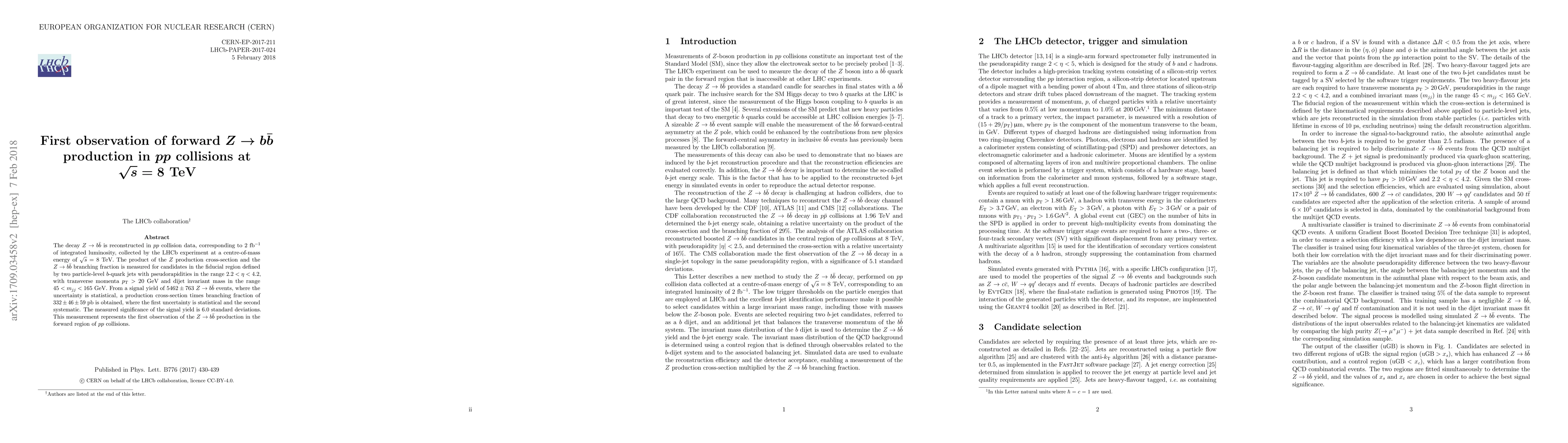 The LHCb experiment observed the first instance of forward $Z \rightarrow b \bar{b}$ production in $pp$ collisions at $\sqrt{s}=8$ TeV, measuring a production cross-section times branching fraction of $332 \pm 46 \pm 59$ pb with a 6.0 standard deviation significance.