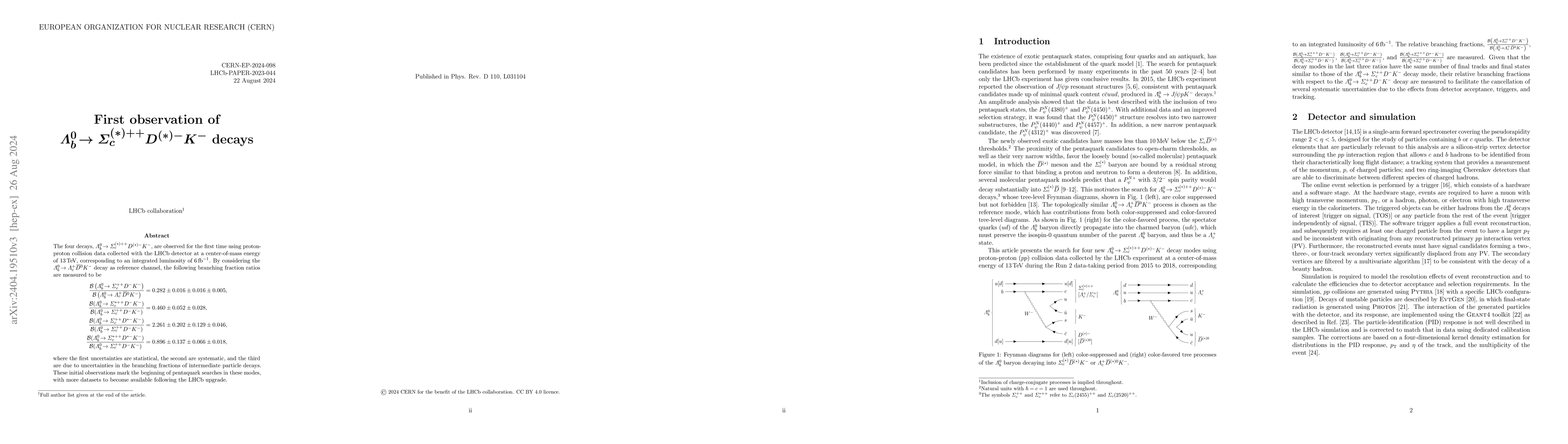 The LHCb experiment first observes four decays of $\Lambda_{b}^{0}$ to $\Sigma_c^{(*)++} D^{(*)-} K^{-}$ using proton-proton collision data at $13\,\rm{TeV}$. Branching fraction ratios relative to the reference decay $\Lambda_b^0 \rightarrow \Lambda_c^{+} \overline{D}^0 K^{-}$ are measured, marking the start of pentaquark searches that will expand with more data from LHCb upgrades.