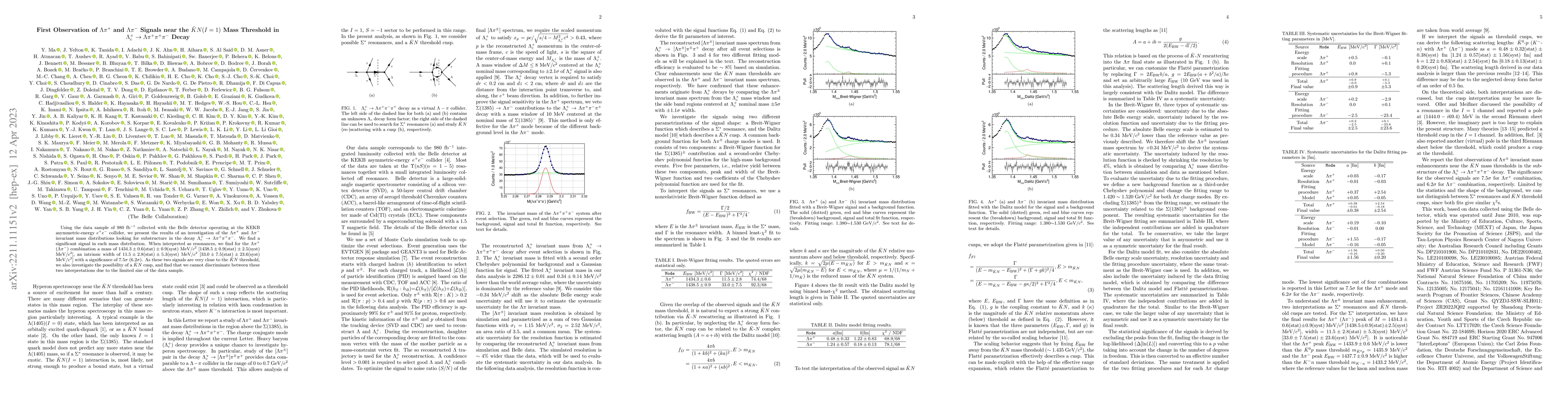 Using the data sample of 980 fb$^{-1}$ collected with the Belle detector operating at the KEKB asymmetric-energy $e^+e^-$ collider, we present the results of an investigation of the $\Lambda\pi^+$ and $\Lambda\pi^-$ invariant mass distributions looking for substructure in the decay $\Lambda_c^+\rightarrow\Lambda\pi^+\pi^+\pi^-$. We find a significant signal in each mass dis\ tribution. When interpreted as resonances, we find for the $\Lambda\pi^+$ ($\Lambda\pi^-$) combination a mass of $1434.3 \pm 0.6 (\mathrm{stat}) \pm 0.9(\mathrm{syst})$ MeV/$c^2$ [$1438.5 \pm 0.9 (\mathrm{stat}) \pm 2.5(\mathrm{syst})$ MeV/$c^2$], an intrinsic width of $11.5 \pm 2.8 (\mathrm{stat}) \pm 5.3(\mathrm{syst})$ MeV/$c^2$ [$33.0 \pm 7.5 (\mathrm{stat}) \pm 23.6(\mathrm{syst})$ MeV/$c^2$] with a significance of 7.5$\sigma$ (6.2$\sigma$). As these two signals are very close to the $\bar{K}N$ threshold, we also investigate the possibility of a $\bar{K}N$ cusp, and find that \ we cannot discriminate between these two interpretations due to the limited size of the data sample.