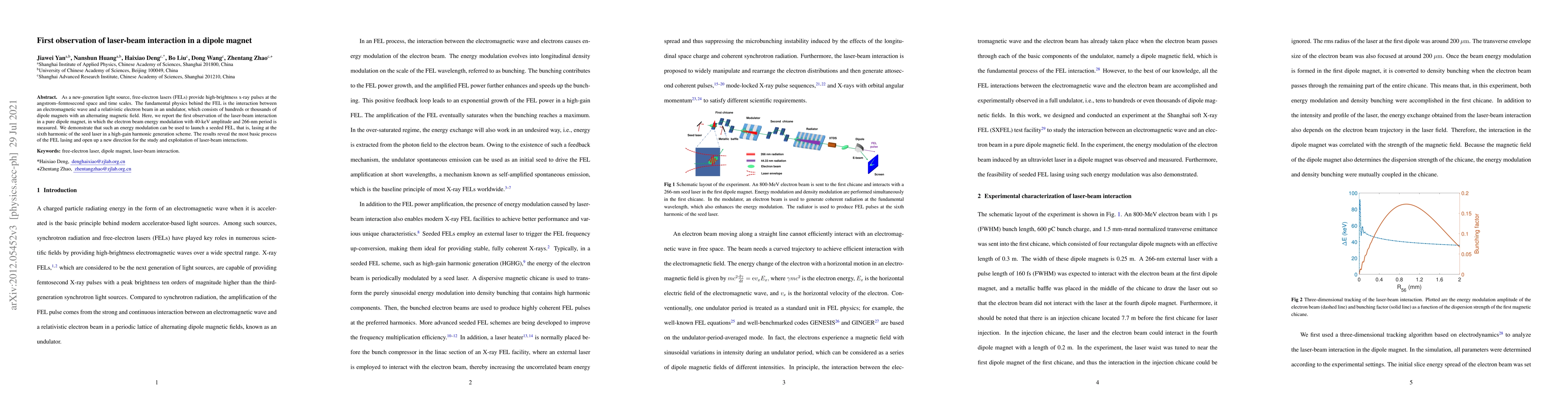 As a new-generation light source, free-electron lasers (FELs) provide high-brightness X-ray pulses at the angstrom-femtosecond space and time scales. The fundamental physics behind the FEL is the interaction between an electromagnetic wave and a relativistic electron beam in an undulator, which consists of hundreds or thousands of dipole magnets with an alternating magnetic field. Here, we report the first observation of the laser-beam interaction in a pure dipole magnet, in which the electron beam energy modulation with 40-keV amplitude and 266-nm period is measured. We demonstrate that such an energy modulation can be used to launch a seeded FEL, that is, lasing at the sixth harmonic of the seed laser in a high-gain harmonic generation scheme. The results reveal the most basic process of the FEL lasing and open up a new direction for the study and exploitation of laser-beam interactions.