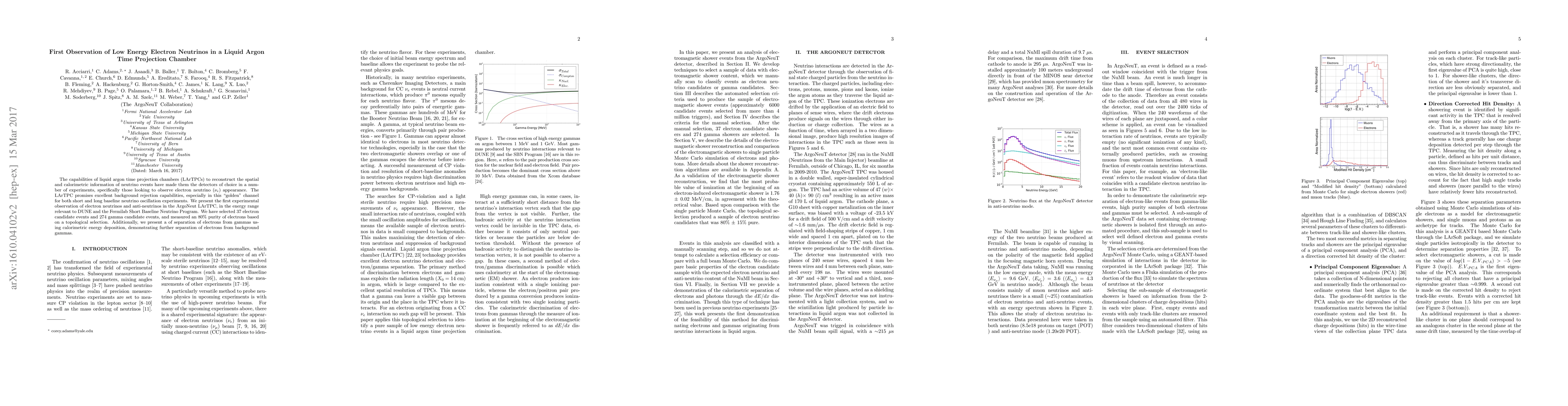 This study presents the first observation of low energy electron neutrinos and anti-neutrinos in a liquid argon time projection chamber (LArTPC), a crucial development for experiments like DUNE and Fermilab's SBN program. The researchers identified 37 electron candidate events and 274 gamma candidate events, achieving an 80% purity through topological selection. Furthermore, they demonstrated effective separation of electrons from gamma backgrounds using calorimetric energy deposition.