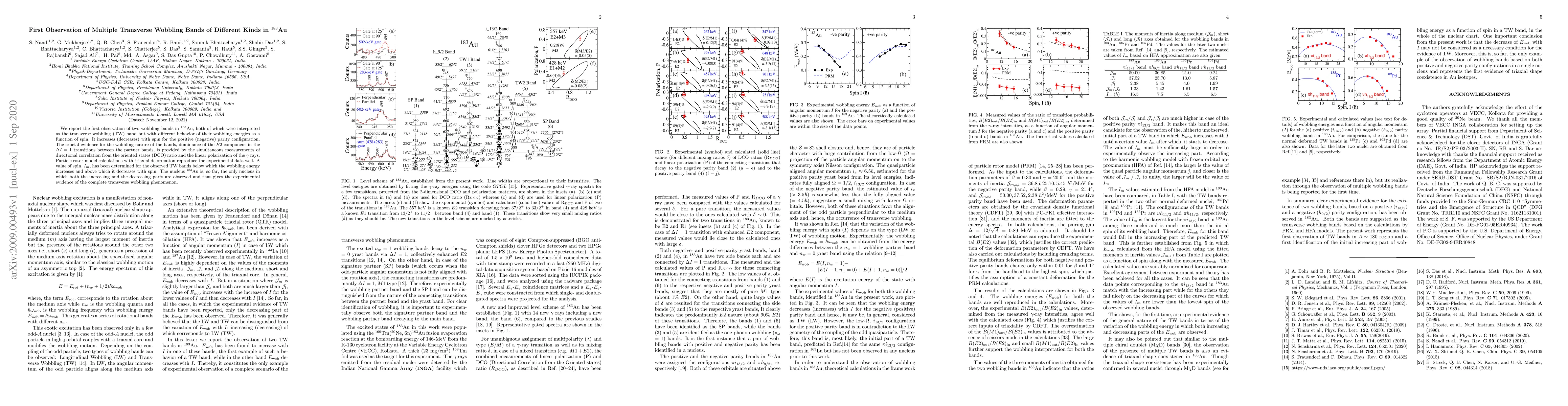 We report the first observation of two wobbling bands in $^{183}$Au, both of which were interpreted as the transverse wobbling (TW) band but with different behavior of their wobbling energies as a function of spin. It increases (decreases) with spin for the positive (negative) parity configuration. The crucial evidence for the wobbling nature of the bands, dominance of the $E2$ component in the $\Delta I = 1$ transitions between the partner bands, is provided by the simultaneous measurements of directional correlation from the oriented states (DCO) ratio and the linear polarization of the $\gamma$ rays. Particle rotor model calculations with triaxial deformation reproduce the experimental data well. A value of spin, $I_m$, has been determined for the observed TW bands below which the wobbling energy increases and above which it decreases with spin. The nucleus $^{183}$Au is, so far, the only nucleus in which both the increasing and the decreasing parts are observed and thus gives the experimental evidence of the complete transverse wobbling phenomenon.