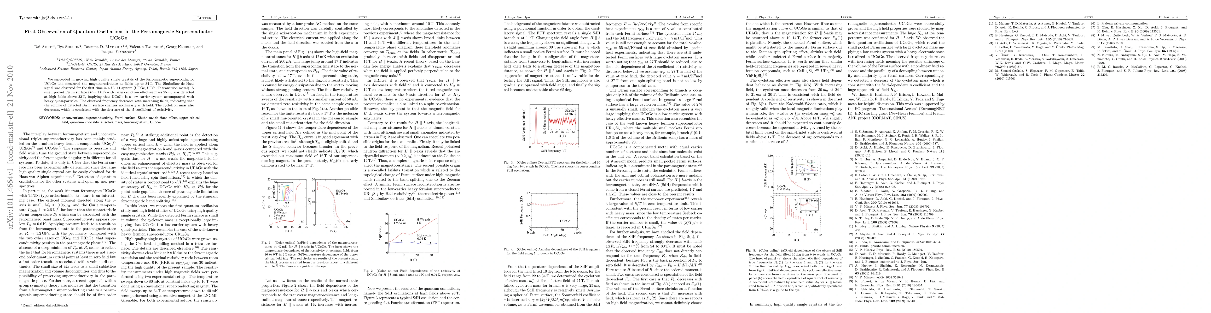 The novelty of this research lies in its discovery of quantum oscillations in UCoGe, a ferromagnetic superconductor, and the revelation of its low carrier system with heavy quasi-particles.