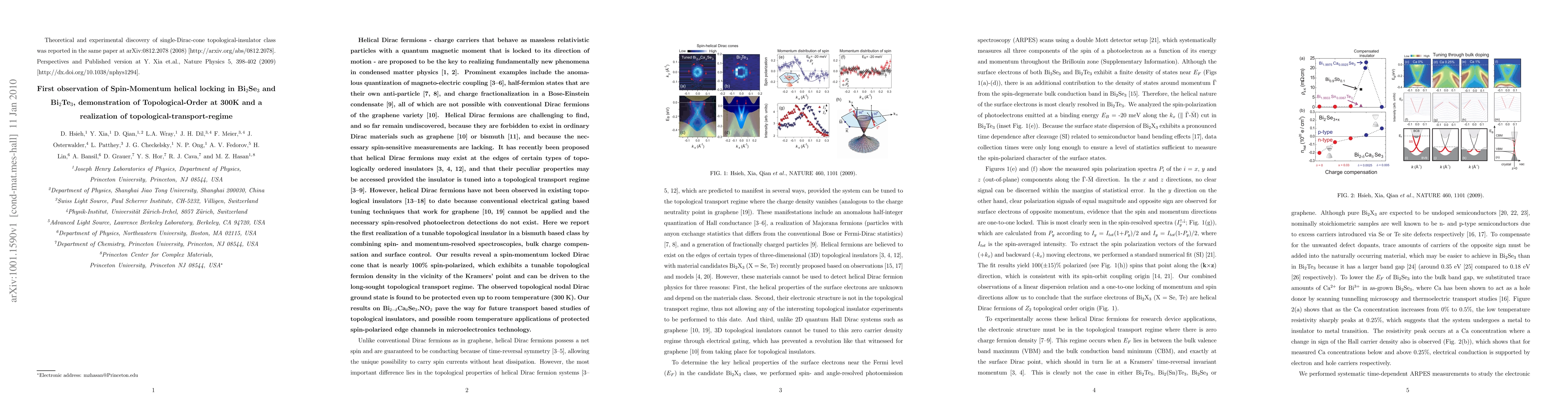 Researchers observe Spin-Momentum Helical Locking in Bi2Se3 and Bi2Te3, demonstrating Topological-Order at 300K and a material realization of the topological-transport-regime for helical Dirac fermions.