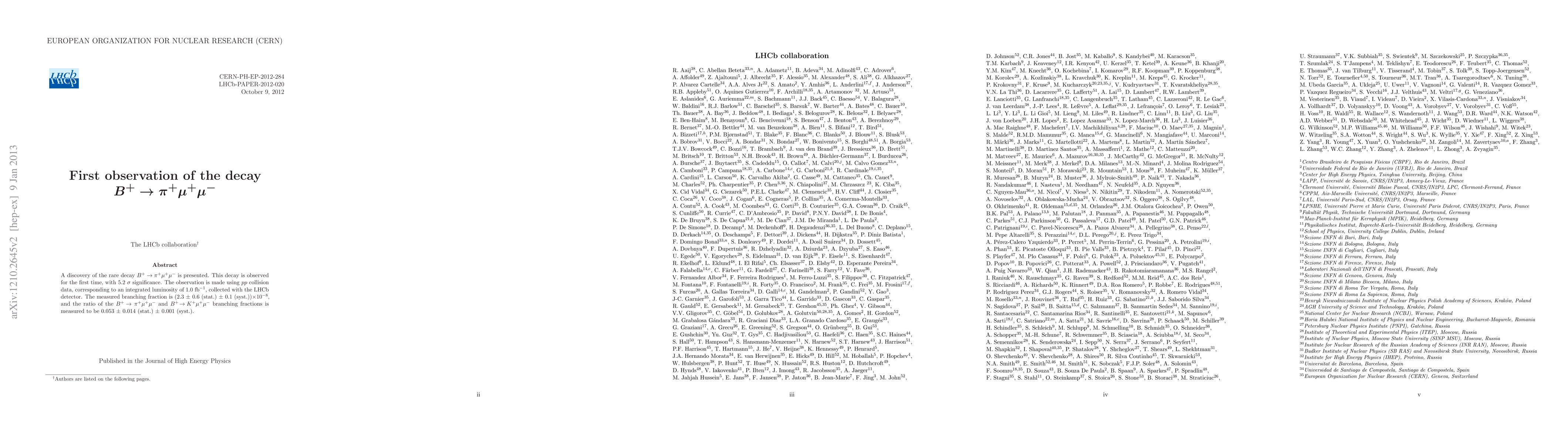 The first observation of the rare decay $B^{+} \rightarrow \pi^{+} \mu^{+} \mu^{-}$ is reported with 5.2 $\sigma$ significance using LHCb data from $pp$ collisions. The measured branching fraction is $(2.3 \pm 0.6 \pm 0.1) \times 10^{-8}$.
