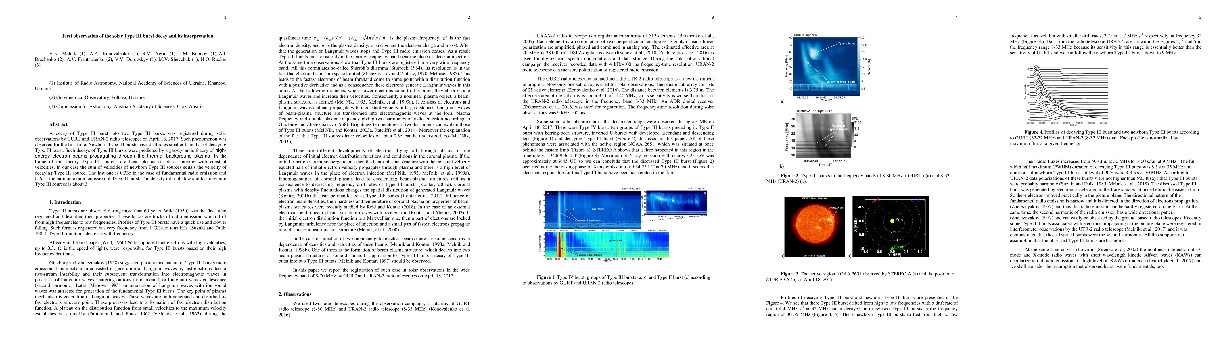 A decay of Type III burst into two Type III bursts was registered during solar observations by GURT and URAN-2 radio telescopes on April 18, 2017. Such phenomenon was observed for the first time. Newborn Type III bursts have drift rates smaller than that of decaying Type III burst. Such decays of Type III bursts were predicted by a gas-dynamic theory of high-energy electron beams propagating through the thermal background plasma. In the frame of this theory Type III sources are beam-plasma structures moving with constant velocities. In our case the sum of velocities of newborn Type III sources equals the velocity of decaying Type III source. The last one is 0.33c in the case of fundamental radio emission and 0.2c at the harmonic radio emission of Type III burst. The density ratio of slow and fast newborn Type III sources is about 3.