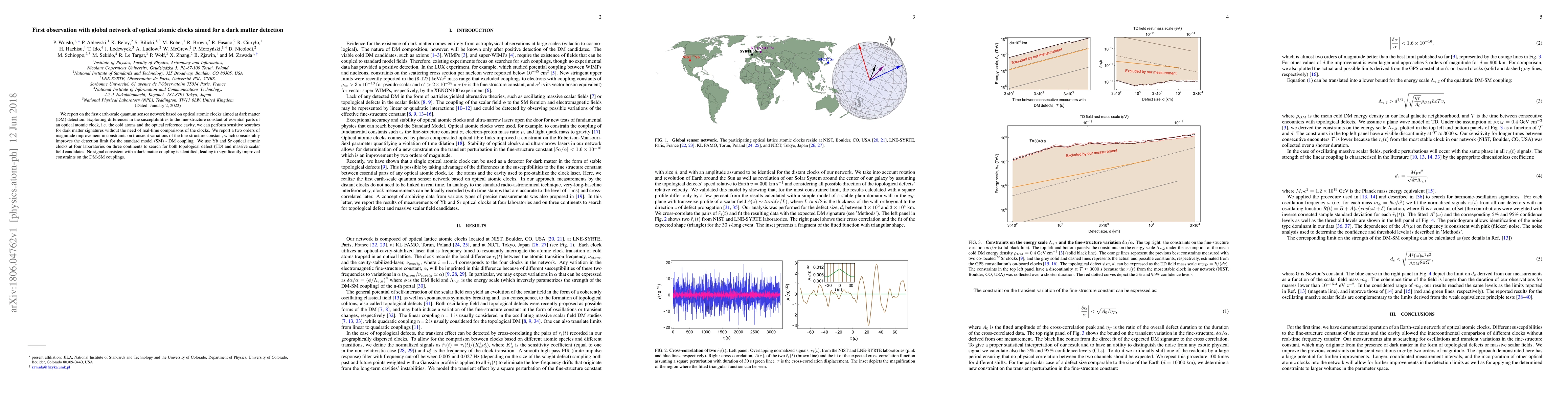 This paper reports on the first global network using optical atomic clocks for dark matter detection, achieving a two-order-magnitude improvement in constraints on fine-structure constant variations. The study uses Yb and Sr clocks across four labs to search for dark matter signatures without real-time clock comparisons, but finds no signals consistent with dark matter coupling.
