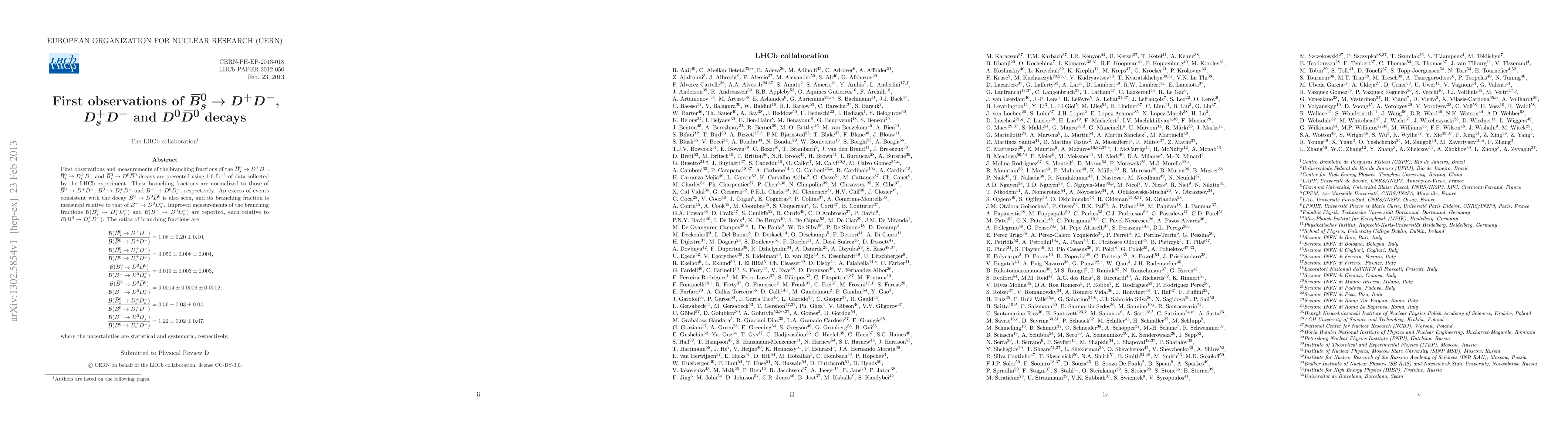 First observations and measurements of the branching fractions of the $\bar{B}_s^0\to D^+D^-$, $\bar{B}_s^0\to D_s^+D^-$ and $\bar{B}_s^0\to D^0\bar{D}^0$ decays are presented using 1.0 fb$^{-1}$ of data collected by the LHCb experiment. These branching fractions are normalized to those of $\bar{B}^0\to D^+D^-$, $B^0\to D_s^+D^-$ and $B^-\to D^0D_s^-$, respectively. An excess of events consistent with the decay $\bar{B}^0\to D^0\bar{D}^0$ is also seen, and its branching fraction is measured relative to that of $B^-\to D^0D_s^-$. Improved measurements of the branching fractions ${\cal{B}}(\bar{B}_s^0\to D_s^+D_s^-)$ and ${\cal{B}}(B^-\to D^0D_s^-)$ are reported, each relative to ${\cal{B}}(B^0\to D_s^+D^-)$. The ratios of branching fractions are {-0.2in} {center} {align*} {{\cal{B}}(\bar{B}_s^0\to D^+D^-)\over {\cal{B}}(\bar{B}^0\to D^+D^-)} &= 1.08\pm 0.20\pm0.10, {{\cal{B}}(\bar{B}_s^0\to D_s^+D^-)\over {\cal{B}}(B^0\to D_s^+D^-)} &= 0.050\pm 0.008\pm0.004, {{\cal{B}}(\bar{B}_s^0\to D^0\bar{D}^0)\over {\cal{B}}(B^-\to D^0D_s^-)} &= 0.019\pm 0.003\pm0.003, {{\cal{B}}(\bar{B}^0\to D^0\bar{D}^0)\over {\cal{B}}(B^-\to D^0D_s^-)} &= 0.0014\pm 0.0006\pm0.0002,{{\cal{B}}(\bar{B}_s^0\to D_s^+D_s^-)\over {\cal{B}}(B^0\to D_s^+D^-)} &= 0.56\pm 0.03\pm0.04, {{\cal{B}}(B^-\to D^0D_s^-)\over {\cal{B}}(B^0\to D_s^+D^-)} &= 1.22\pm 0.02\pm0.07, {align*} {center} \noindent where the uncertainties are statistical and systematic, respectively.
