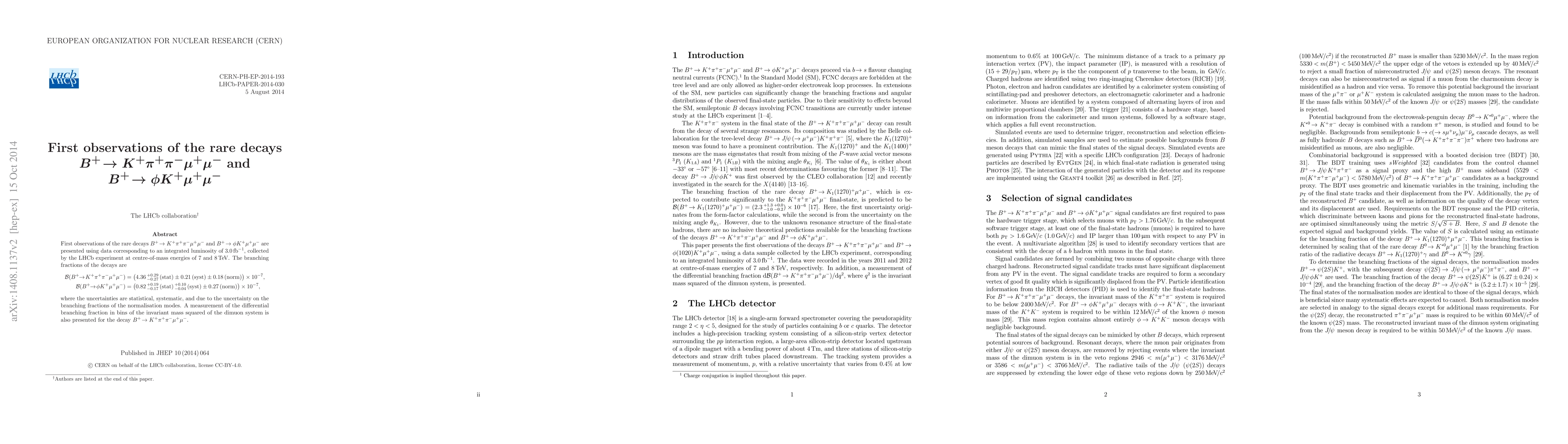 This paper reports the first observations of the rare decays $B^+\rightarrow K^+\pi^+\pi^-\mu^+\mu^-$ and $B^+\rightarrow \phi K^+\mu^+\mu^-$ using LHCb data at $7$ and $8$ TeV. The branching fractions are measured to be $(4.36\pm0.56)\times10^{-7}$ and $(0.82\pm0.27)\times10^{-7}$, respectively.