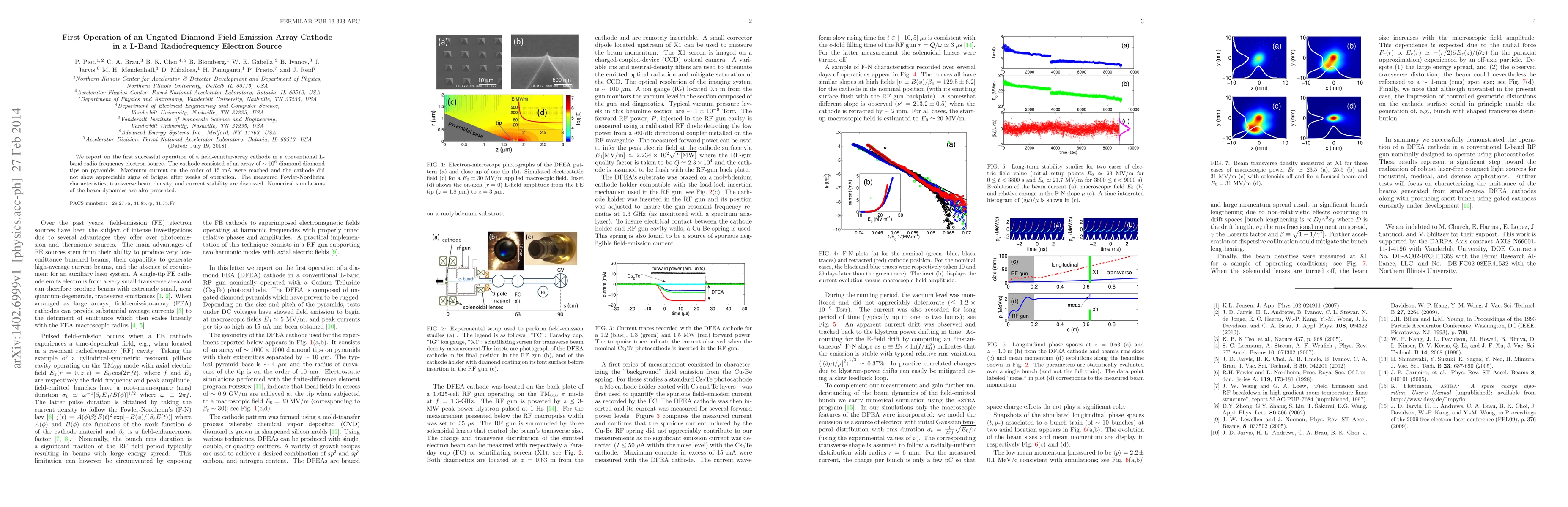We report on the first successful operation of a field-emitter-array cathode in a conventional L-band radio-frequency electron source. The cathode consisted of an array of $\sim 10^6$ diamond diamond tips on pyramids. Maximum current on the order of 15~mA were reached and the cathode did not show appreciable signs of fatigue after weeks of operation. The measured Fowler-Nordheim characteristics, transverse beam density, and current stability are discussed. Numerical simulations of the beam dynamics are also presented.
