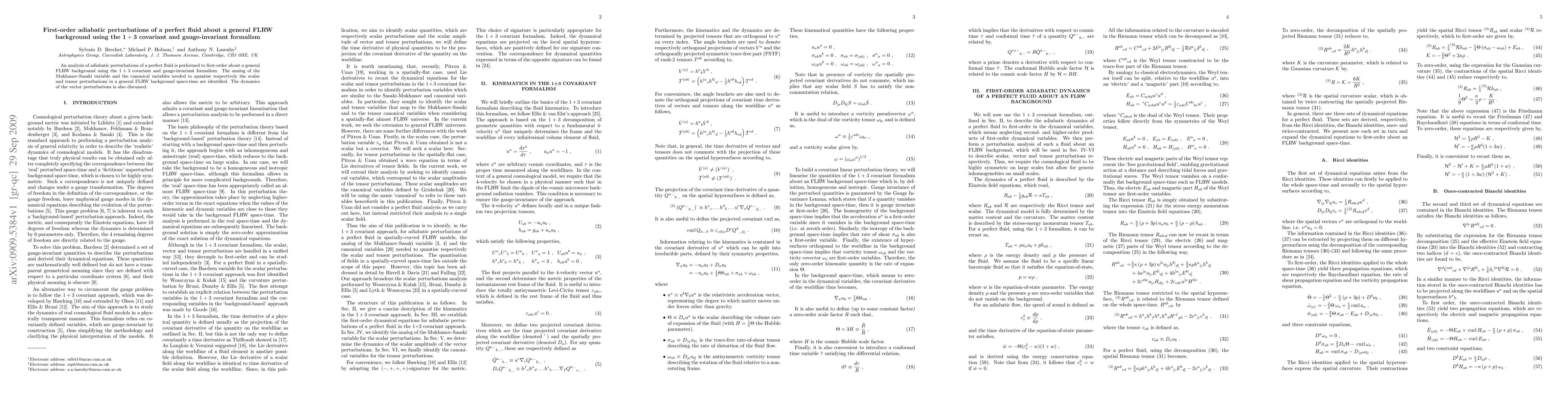 This paper analyzes first-order adiabatic perturbations of a perfect fluid in a general FLRW background using the 1+3 covariant and gauge-invariant formalism, identifying the Mukhanov-Sasaki variable and canonical variables for scalar and tensor perturbations, and discussing the dynamics of vector perturbations.
