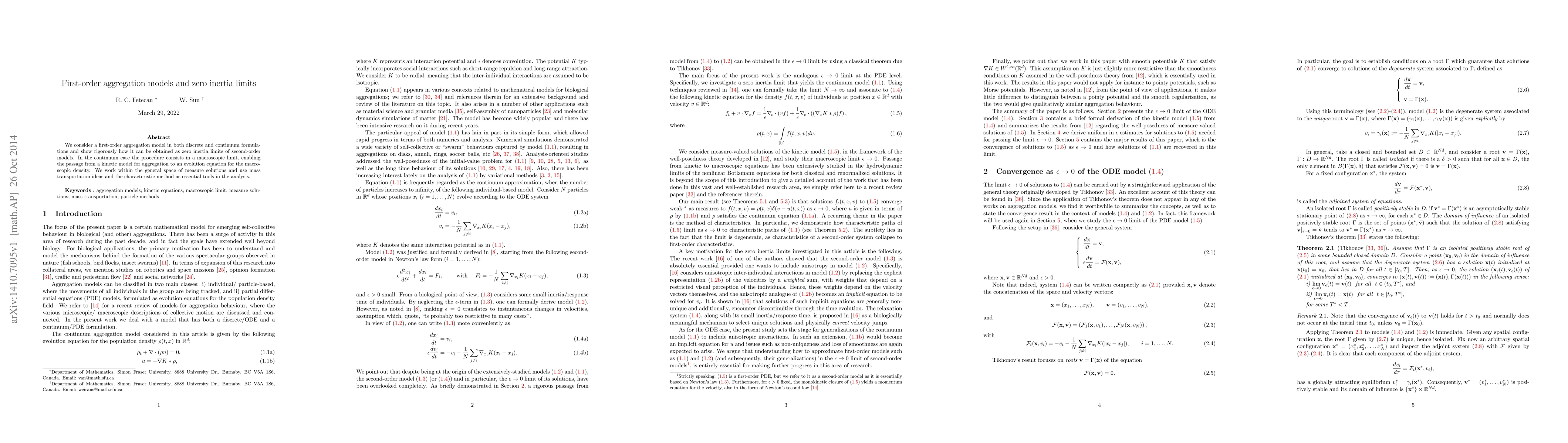 Researchers show how a first-order aggregation model can be derived from second-order models as limits with zero inertia, enabling the transition to macroscopic density equations in both discrete and continuum cases.