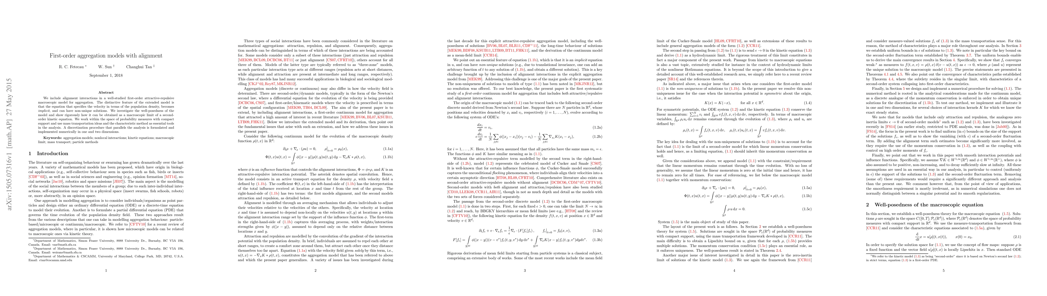We include alignment interactions in a well-studied first-order attractive-repulsive macroscopic model for aggregation. The distinctive feature of the extended model is that the equation that specifies the velocity in terms of the population density, becomes {\em implicit}, and can have non-unique solutions. We investigate the well-posedness of the model and show rigorously how it can be obtained as a macroscopic limit of a second-order kinetic equation. We work within the space of probability measures with compact support and use mass transportation ideas and the characteristic method as essential tools in the analysis. A discretization procedure that parallels the analysis is formulated and implemented numerically in one and two dimensions.