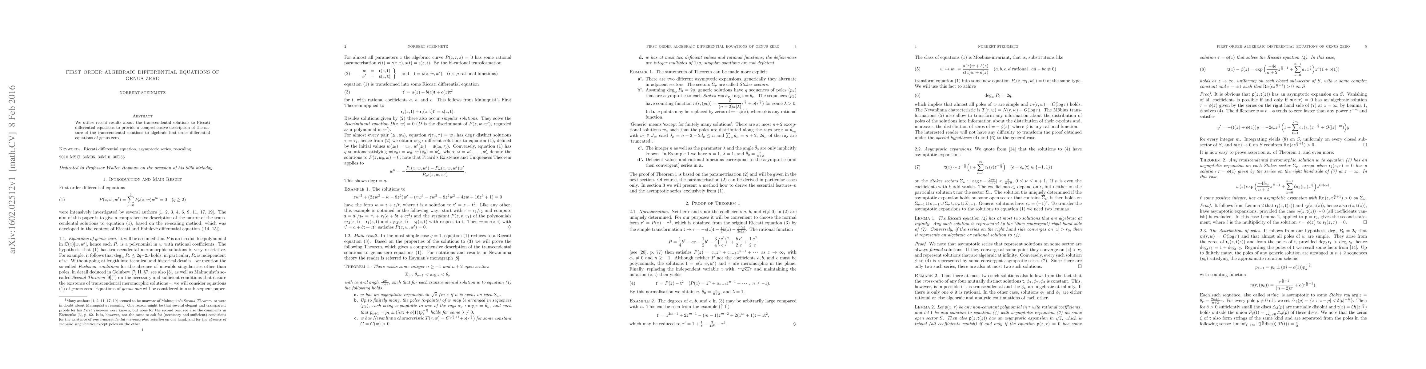 The paper presents a detailed analysis of the asymptotic behavior of transcendental solutions to algebraic first-order differential equations of genus zero, leveraging recent advancements in understanding Riccati differential equations.