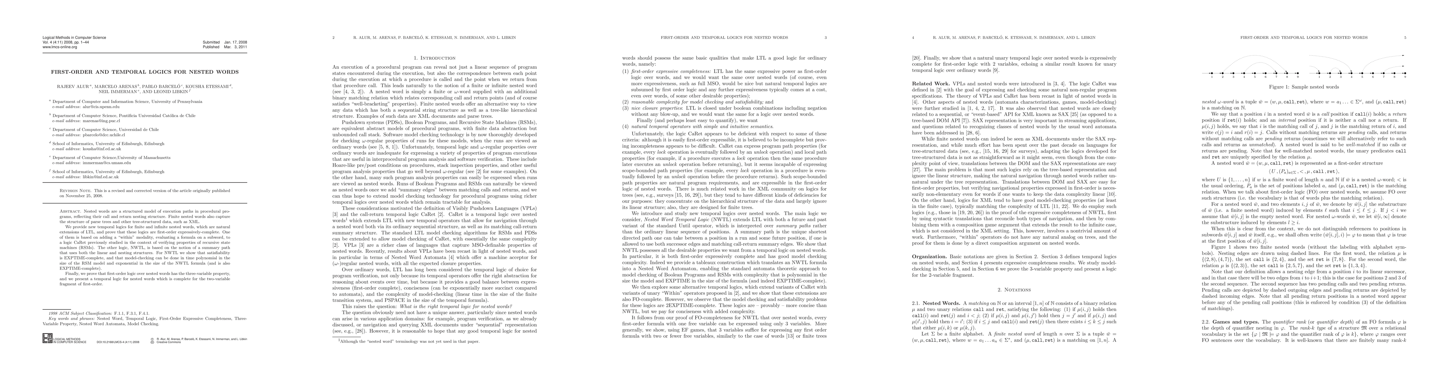 This paper introduces new temporal logics for finite and infinite nested words, extending LTL to capture the call and return structure of procedural programs and tree-structured data. It demonstrates first-order expressive completeness and EXPTIME-complete satisfiability for one logic, while also showing that model-checking for another logic is EXPTIME-complete.