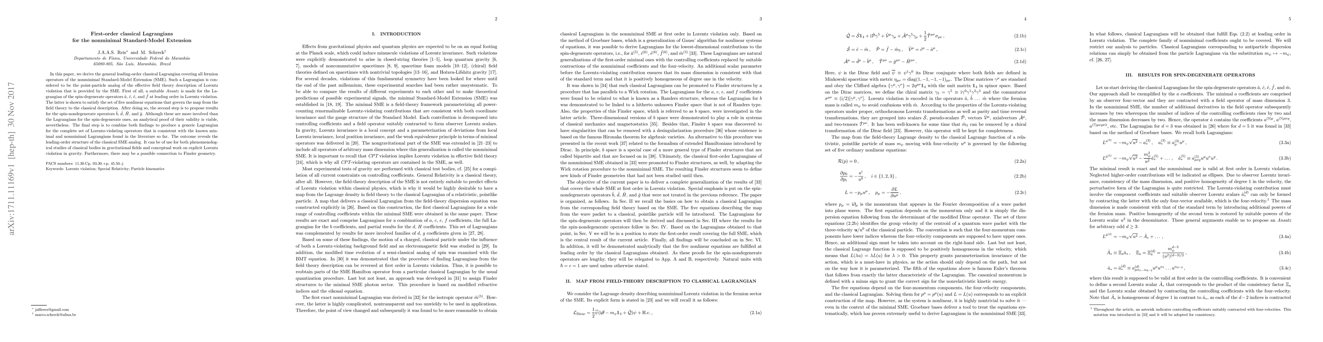 This paper derives the general first-order classical Lagrangian for all fermion operators of the nonminimal Standard-Model Extension (SME), providing a point-particle analog of the SME's Lorentz-violating effective field theory. It combines results for both spin-degenerate and nondegenerate operators to produce a consistent Lagrangian structure.