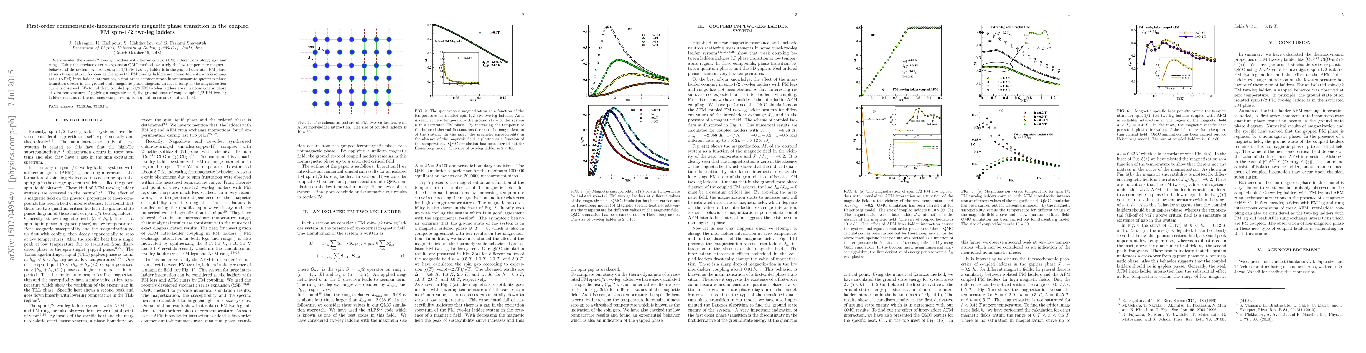 We consider the spin-1/2 two-leg ladders with ferromagnetic (FM) interactions along legs and rungs. Using the stochastic series expansion QMC method, we study the low-temperature magnetic behavior of the system. An isolated spin-1/2 FM two-leg ladder is in the gapped saturated FM phase at zero temperature. As soon as the spin-1/2 FM two-leg ladders are connected with antiferromagnetic (AFM) inter-ladder interaction, a first-order commensurate-incommensurate quantum phase transition occurs in the ground state magnetic phase diagram. In fact a jump in the magnetization curve is observed. We found that, coupled spin-1/2 FM two-leg ladders are in a nonmagnetic phase at zero temperature. Applying a magnetic field, the ground state of coupled spin-1/2 FM two-leg ladders remains in the nonmagnetic phase up to a quantum saturate critical field.